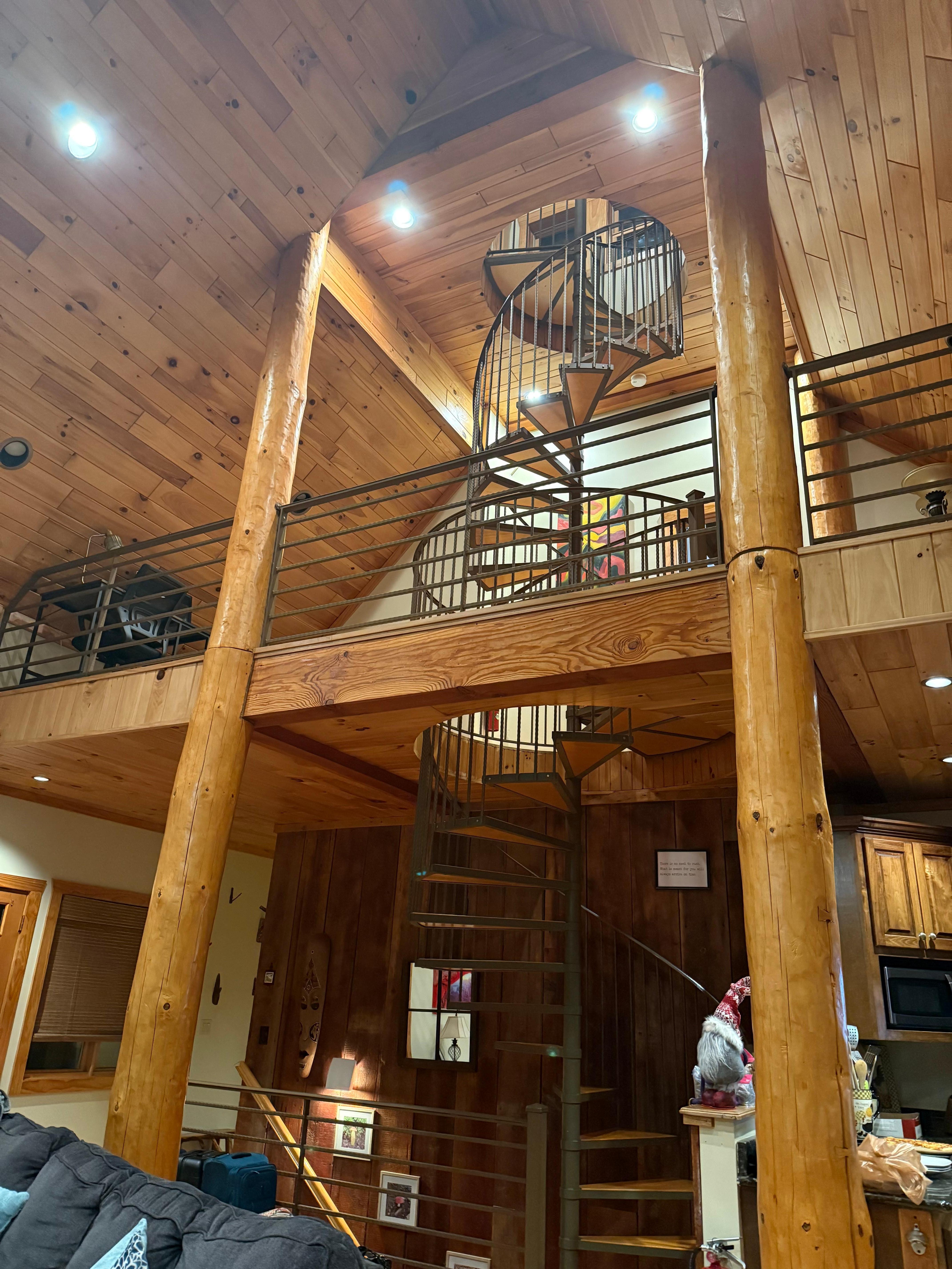 Continue up the spiral stairs from the loft to access the widow's peak, surrounded by windows, offering the highest views within miles on this side of the Parkway! The widow's peak, is ideal for enjoying the mountains and sunrises.