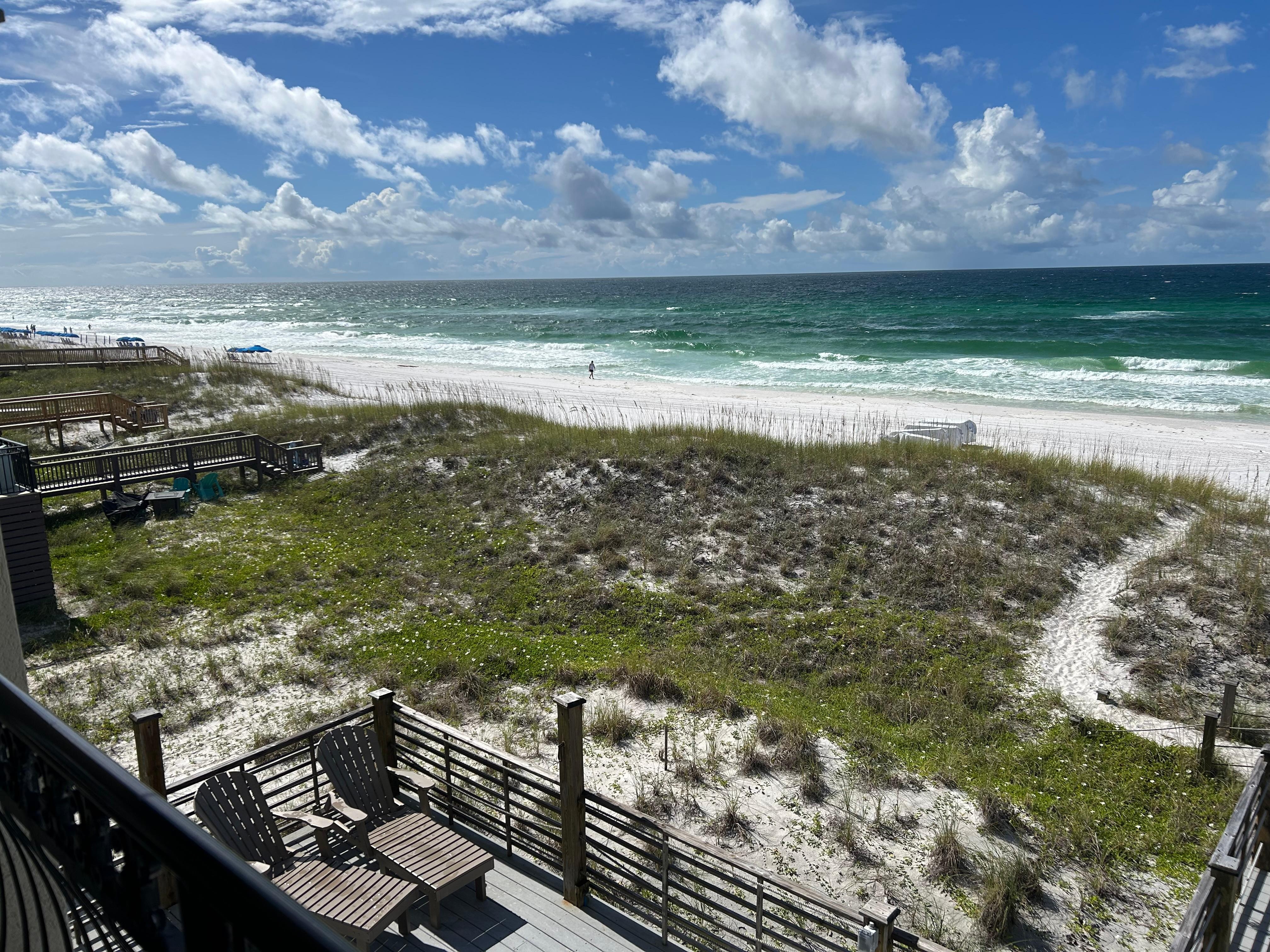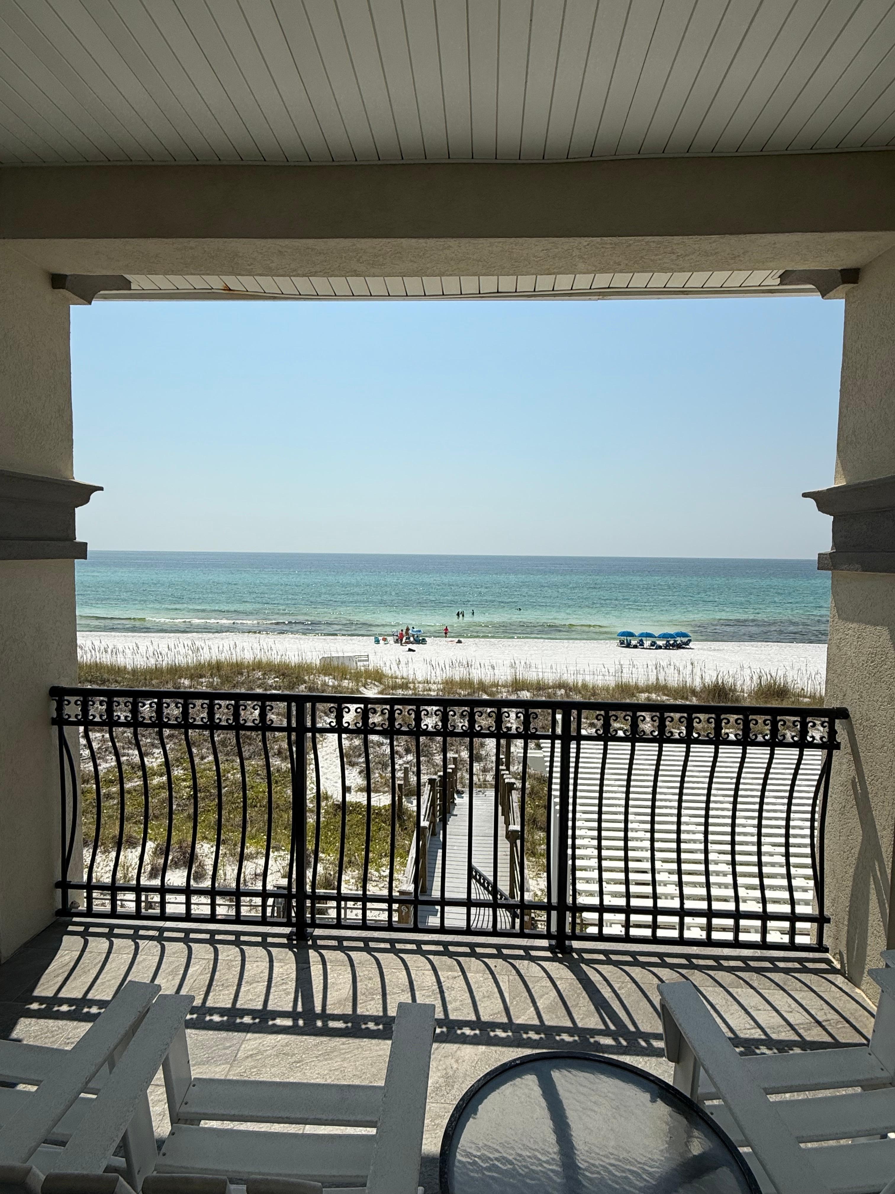 The second floor has wall-to-wall windows in the living area, allowing an extraordinary view of the Gulf. The cozy seating area offers ample seating and includes a sleeper sofa. The beautiful indoor fireplace is meant for visual enjoyment only and is not intended for guest use. There’s a half bath on this level. An intimate dining area and adjacent bar stools at the counter are one option for meals, but there’s outdoor dining too with a grill for barbecues. The kitchen has adequate counter space for several cooks to work simultaneously, yet with the open concept design no one will feel left out. All the culinary necessities of home are provided. Also, the second level has a fourth king bedroom with an ensuite bath and a lovely walk-in shower.