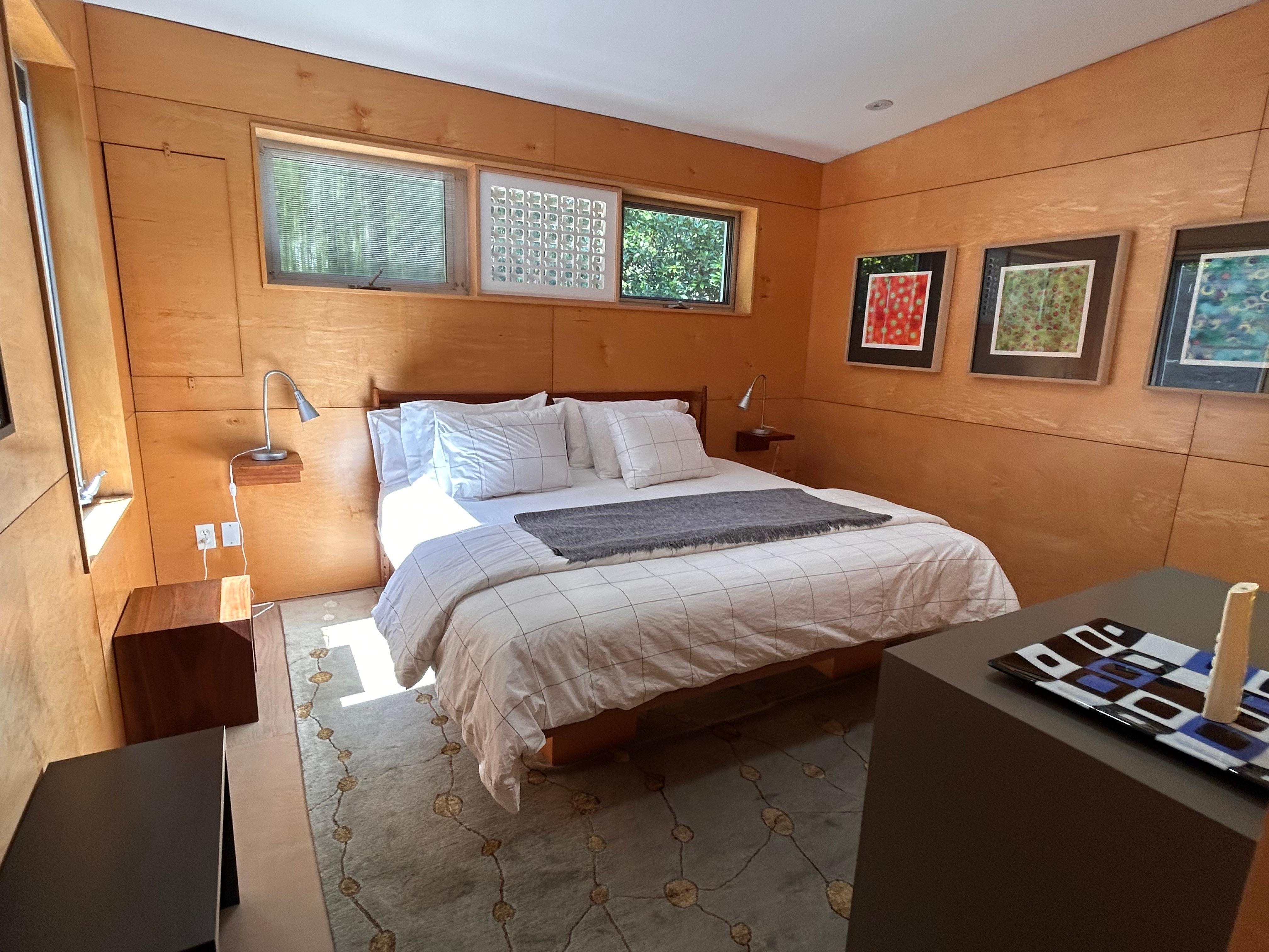 The guest house has a private bedroom with a King size tempeurpedic bed; high ceilings; Modern Bath with beautiful fixtures and shower; heated floor and heated towel rack; large glass windows and doors. A gorgeous Front Deck overlooks a pond.