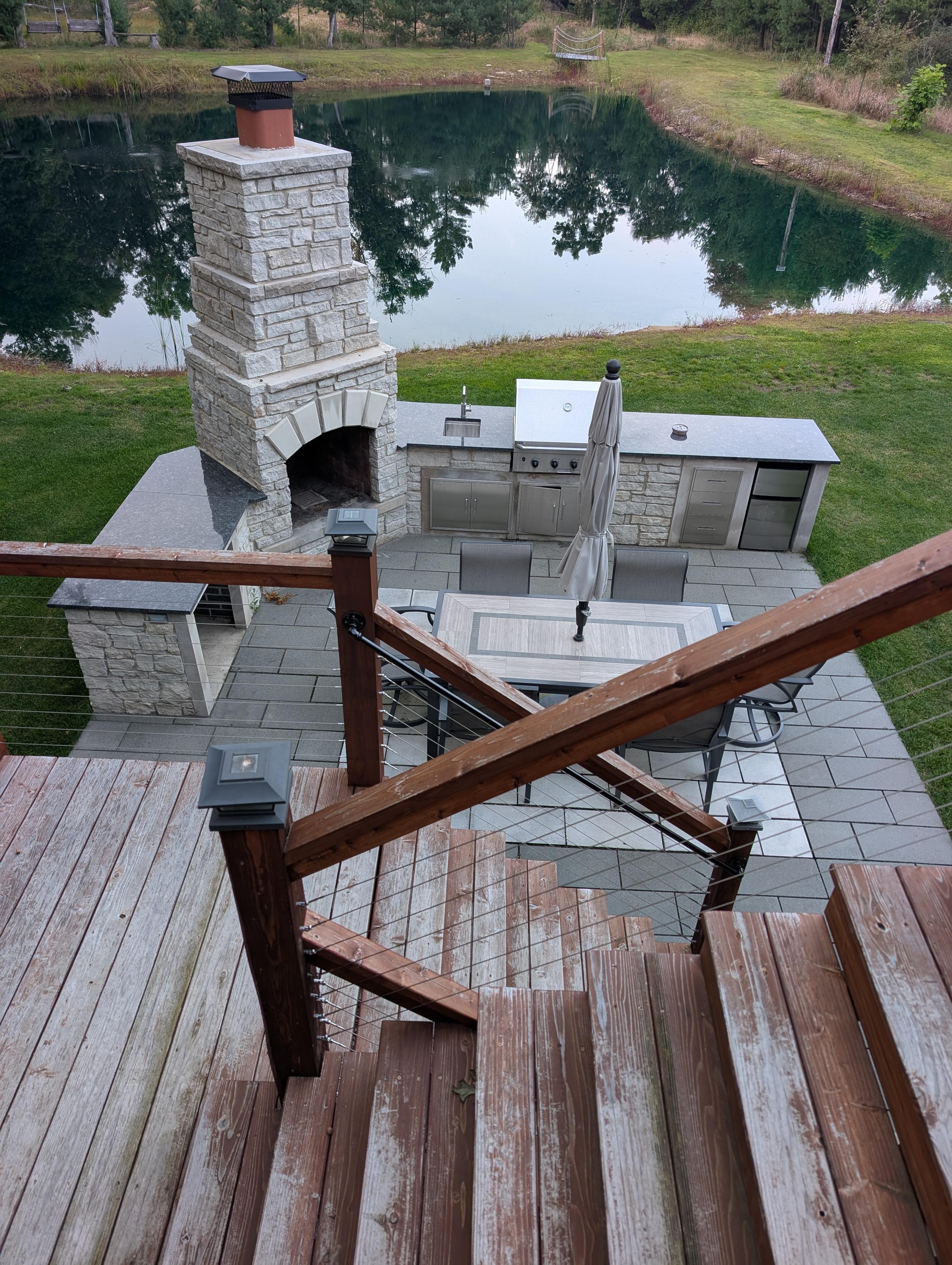 One of the highlights of this vacation rental is the outdoor space.The multiple decks provide plenty of opportunities to enjoy the surrounding forest and the tranquil pond.The outdoor fireplace is perfect for gathering around during cooler evenings and roasting marshmallows or enjoying a glass of wine.There’s also gas BBQ grill,small fridge and a fire pit surrounding by wood benches.