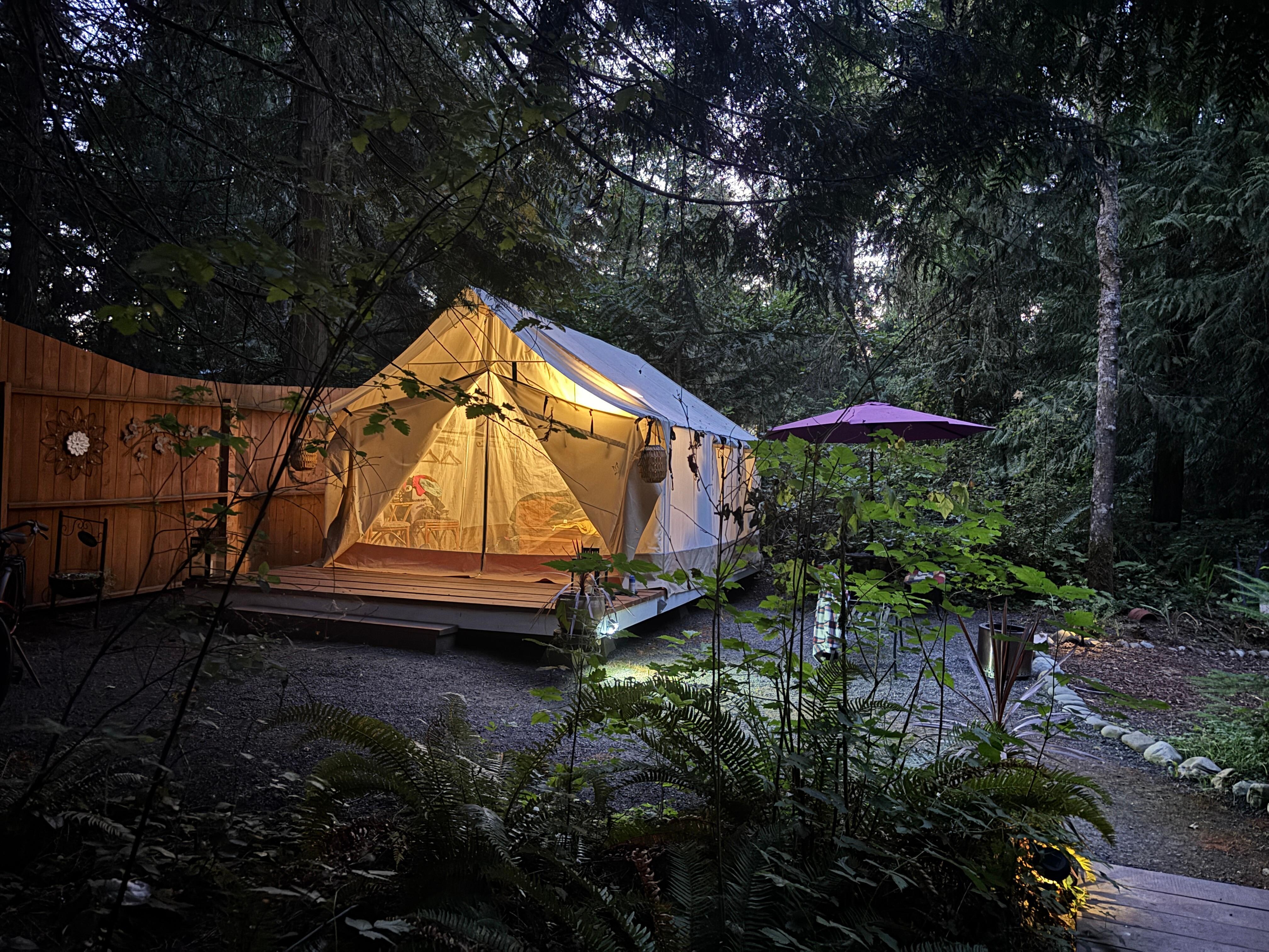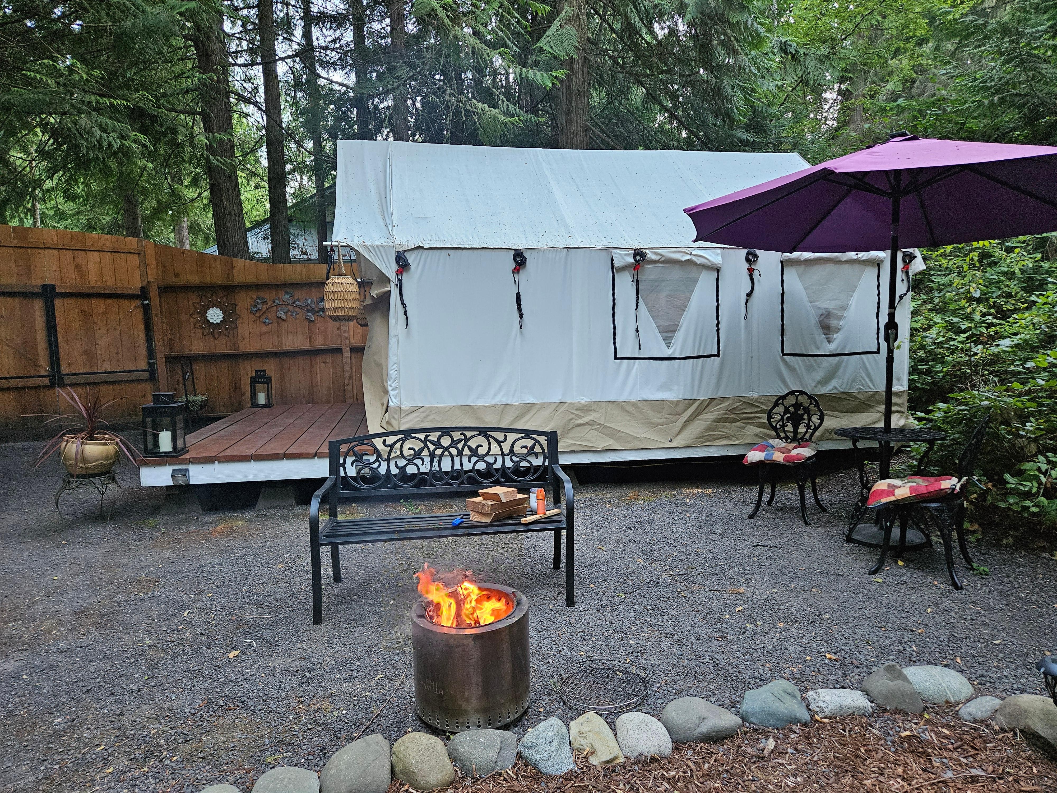 My wife and I stayed here for one night to celebrate our 8-year wedding anniversary. The pictures and description of the listing were accurate. The tent is very spacious (I am 6’4” and could comfortably stand in the tent. The bed was very comfortable. The outdoor space was nicely kept (my wife loved the hammock). The outhouse is nice with a shower with hot water. This was definitely a great choice and a better price than staying at nearby hotels. It is also within 10 minutes of the casino and good food in Sequim. I’d definitely recommend this to my family and friends.