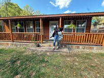 Cabin features private patio and dining area backed into its own personal wooded nook. The Firepit comes stocked with full-sized adult swings and 2 free bundles of firewood (more available to purchase on site)!! Cook your favorite meal in the full-size kitchen or outside over the fire and serve on our hand-crafted outdoor dining bar.
