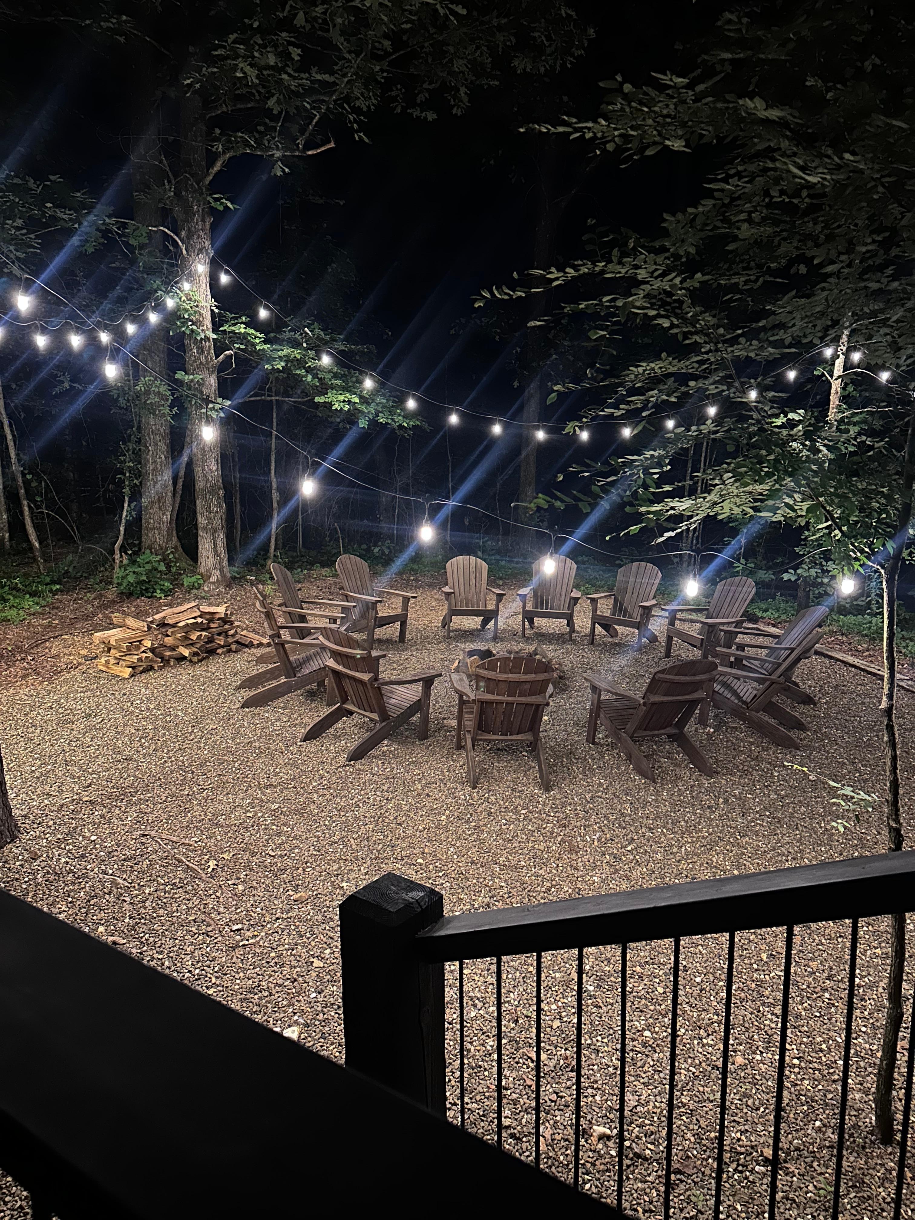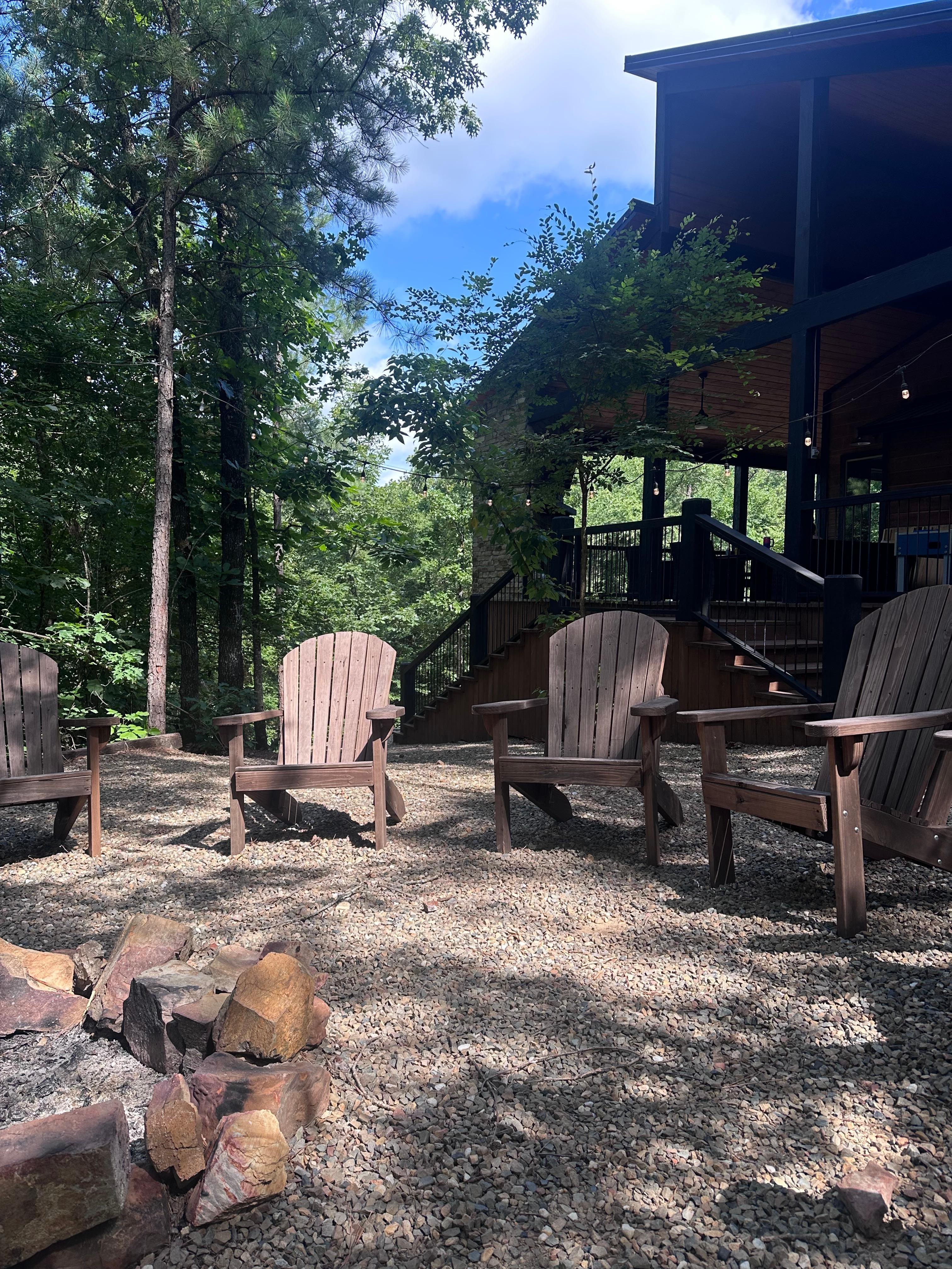 Venture down the stairs to a welcoming fire pit area, where Adirondack chairs invite you to unwind, perfect for s'mores making and stargazing sessions. Nearby, a horseshoe pit adds to the outdoor fun, ensuring there's never a dull moment during your stay at this serene retreat.