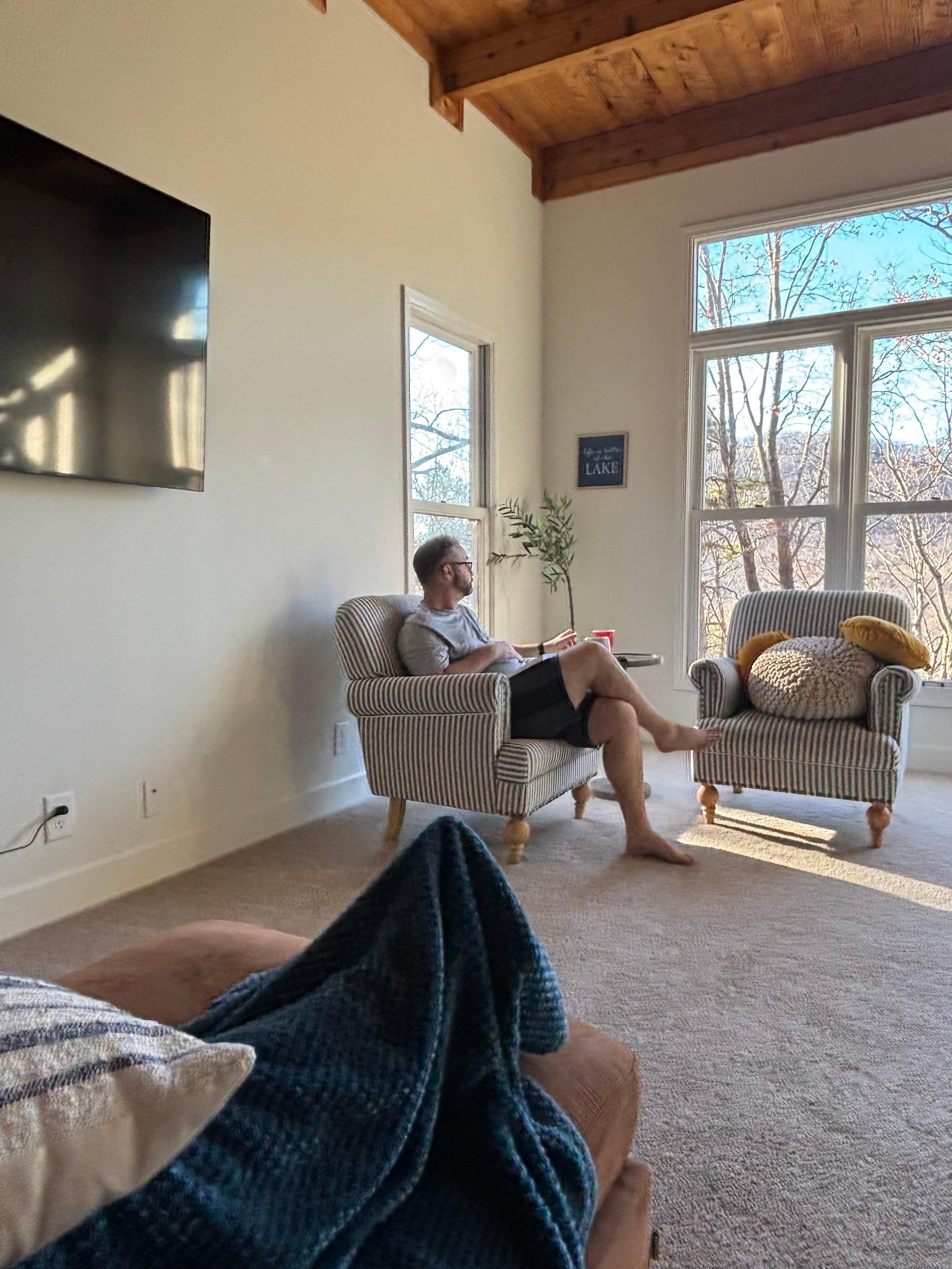 Master on main has a king bed and leather chair for relaxing. Enjoy the private deck with chairs overlooking the mountains, perfect for a morning coffee or evening night cap. Private bathroom includes massive soaking tub, separate shower, double vanity sinks, plant wall, full length mirror and plenty of storage.