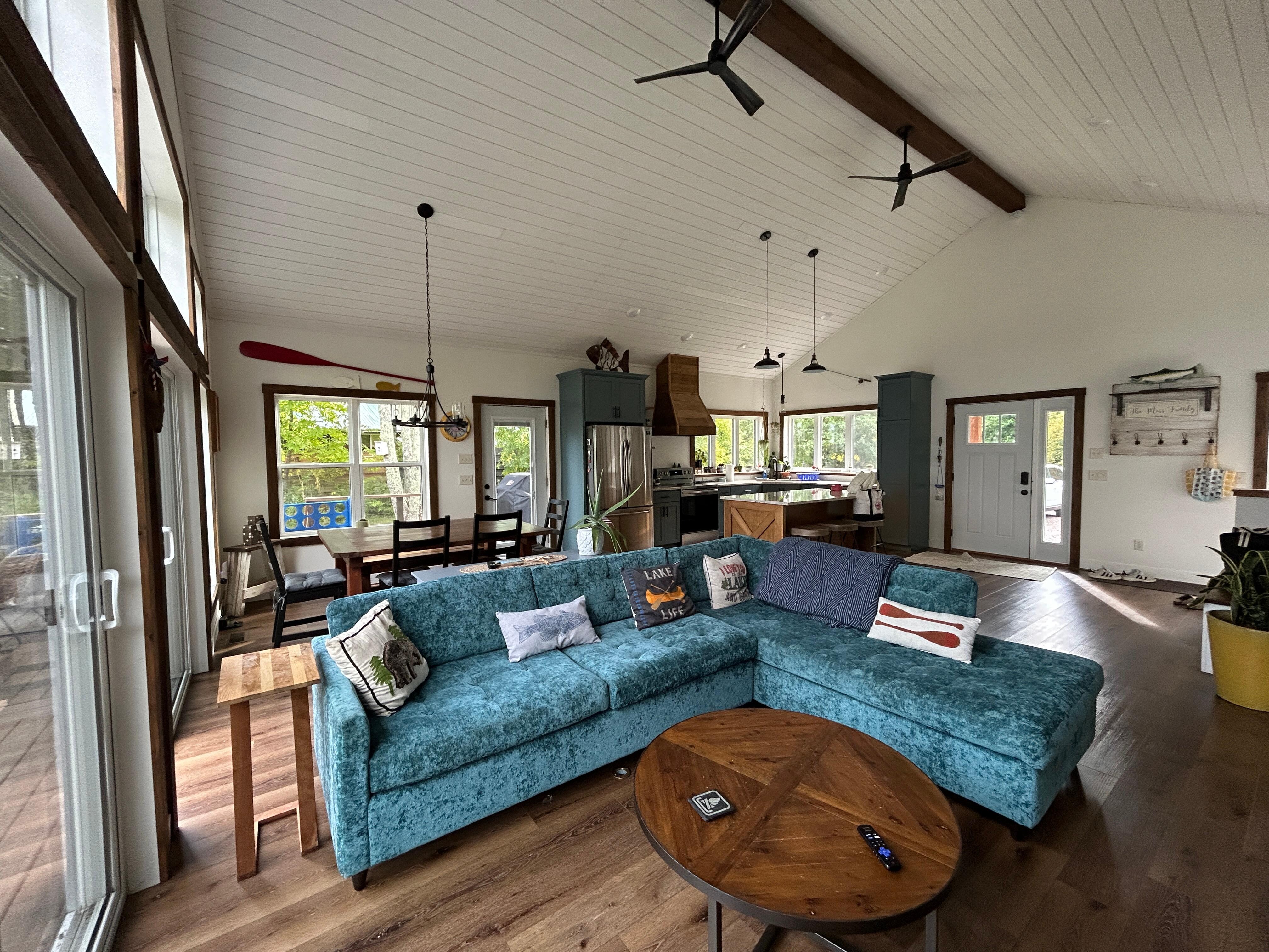 Our cabin features an open concept design, with tons of windows and natural light flooding the space. Whether you're snuggled up on the couch or cooking in the kitchen, you'll feel right at home. Step outside onto the deck to enjoy the fresh air and stunning views.