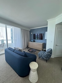 The one-bedroom is approximately a 1000 sq. ft. unit with a separate private bedroom that sleeps 4 people -- between the standard king size bed in the bedroom and another standard queen size sofa bed that acts as the second bed in the living room. To accommodate the 5th, you may rent a rollaway bed that can be brought into the room upon request for an additional $60 for the rollaway bed and/or crib per night or a maximum of $200 + tax each (if renting for 5 nights or more).