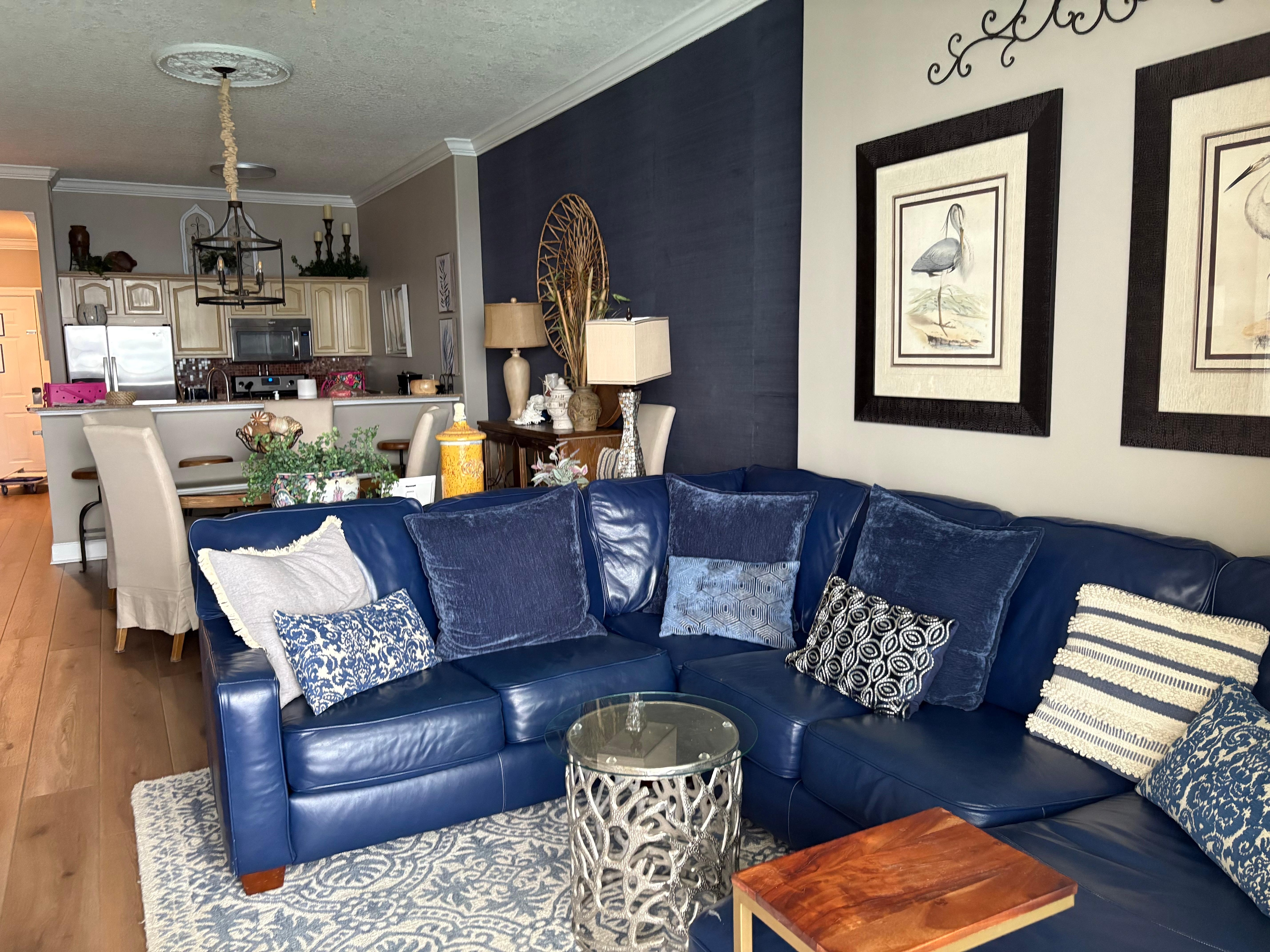 The living room features a wrap around, leather, sectional sofa and arm chair that provides ample sitting for everyone. Enjoy gazing at the beautiful gulf water or watching evening movies on the wall-mounted, large screen, TV (with soundbar), or stretching out and taking relaxing naps on the comfortable sofa.