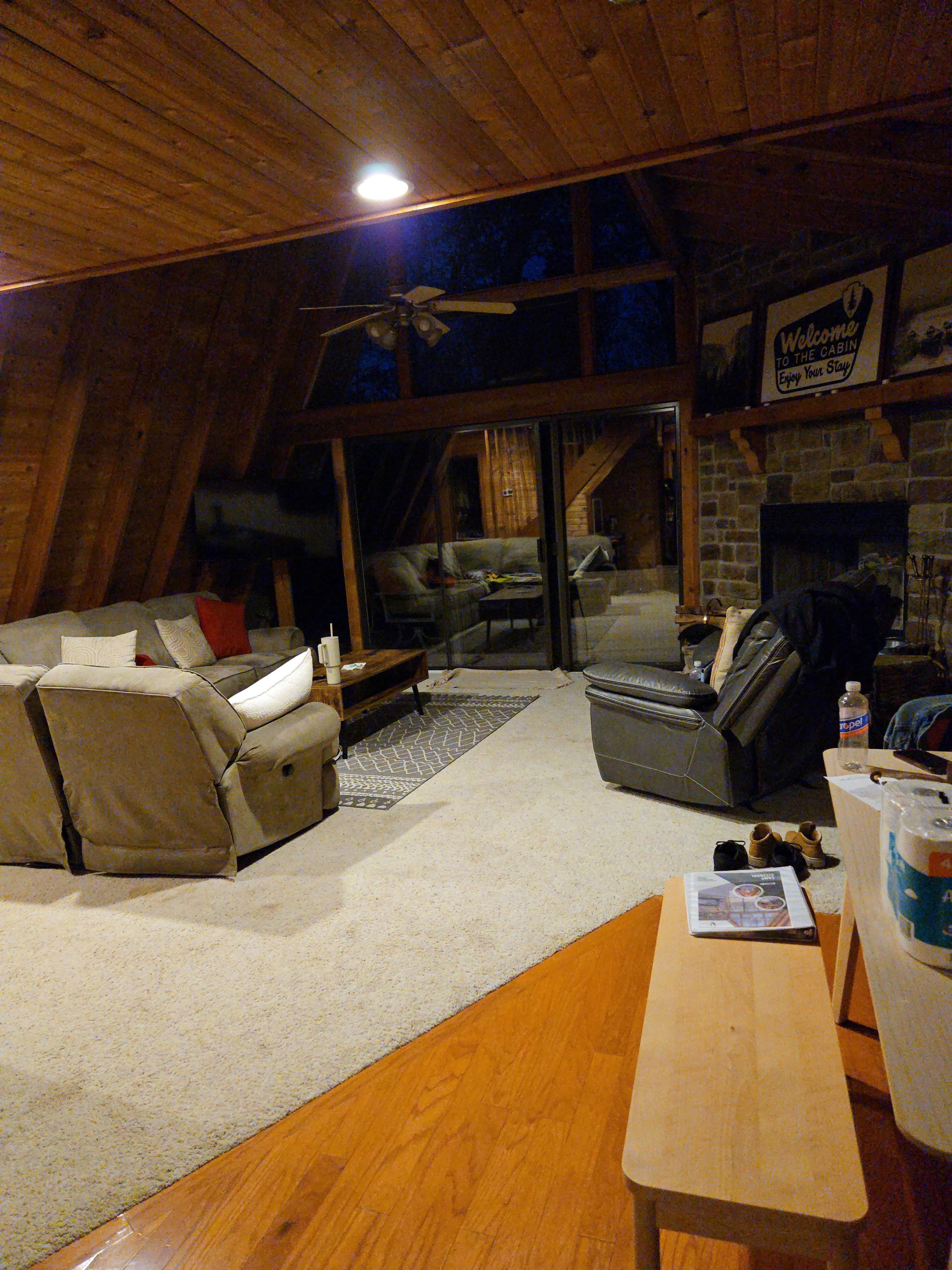 • Roomy living area with plush furniture, TV, stone fire place, and sliding glass doors to the back deck