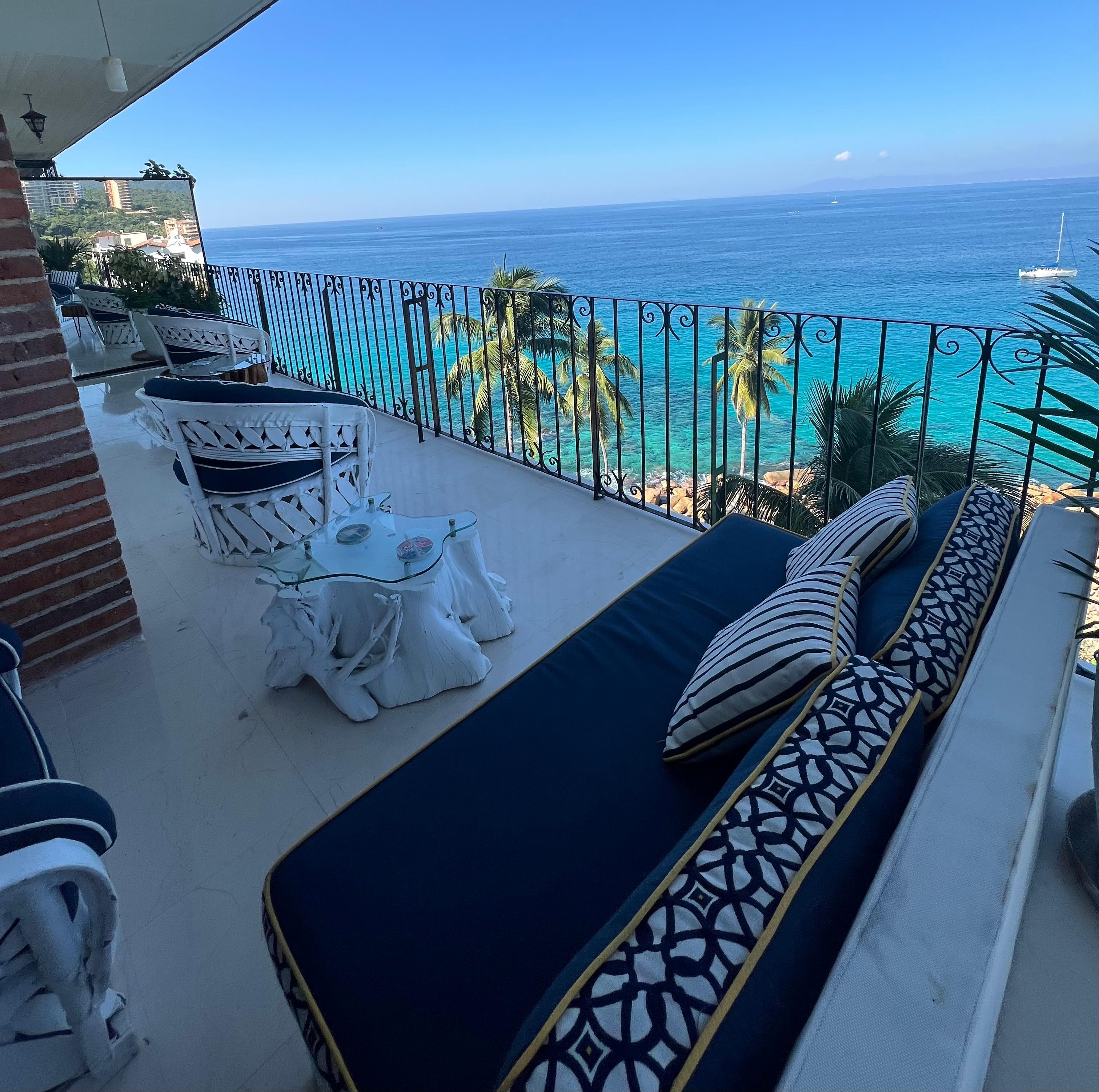 This Beachfront/Oceanfront 1800 sq. ft. , 3 BR, 2.5BA condo offers spectacular panoramic views of Bahia de Banderas Bay. It is nestled into a peaceful cove, surrounded by lush and colorful tropical plants. It is situated on the finest swimming beach in the Puerto Vallarta area. This is a gated community with 24 hr. security and a highly service oriented English speaking staff. Our unit is located on the 7th floor of an end building. The views are panoramic and unobstructed. The condo was fully renovated during the Summer of 2015 in a comfortable high end modern style. It now boasts Crema Nevada marble floors throughout, custom tiled bathrooms, onyx and marble counter tops, all new appliances and fixtures, and a beautifully updated decor. The unit is completely equipped with everything you might need. Dishes, utensils and cookware are plentiful. The bedrooms feature comfortable beds with hotel quality mattresses and linens. There are two King suites and one double with its own half bath. Each bedroom has its own air conditioning unit. Off the Living Room and the Master Bedroom is a spacious balcony where, at the end of another day in paradise, you can watch the dramatic sunsets that are typical in PV. During the day, it is your perch to watch pelicans, dolphins or even whales passing by.