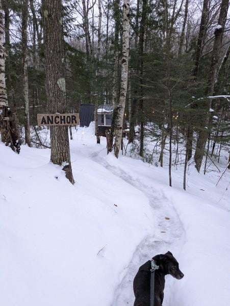 The campground is spread out over 5 acres of forest on Bresette Hill Road. After parking at the trailhead, you’ll gather your bags and hike into your glamping site. The trail winds through the woods, leading you first to a valley where the seasonal Clark Creek runs through in the spring. The first two campsites are on the other side of this valley. The trail can be steep in spots and requires a moderate level of fitness and mobility to reach the secluded campsites. The third site is a bit farther into the forest, the little A-frame cabin, Anchor sits on the edge of the spring-fed Brickyard Creek that flows year-round.