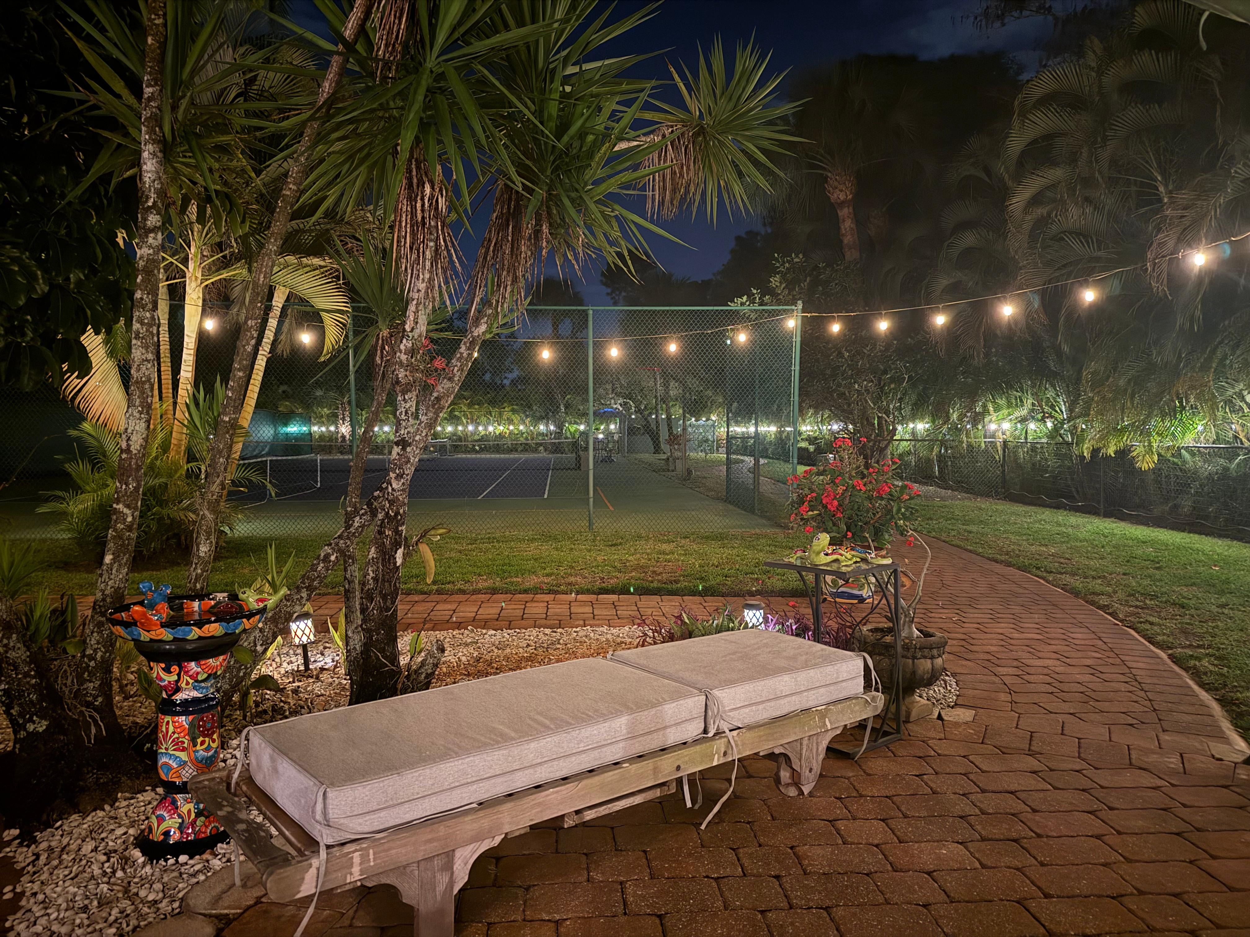 Step outside to discover more than a full acre of ultra-private outdoor living, a true rarity in Naples. Enjoy the resort-style pool with a cascading waterfall, a private tennis and pickleball court, an orchid garden, and multiple lounge and dining areas. The expansive tropical patio comes alive in the evenings with hundreds of solar and string lights, perfect for outdoor dinners, conversation, and stargazing. White terry cloth-covered chaise lounges, plush robes, and slippers are provided for every guest.