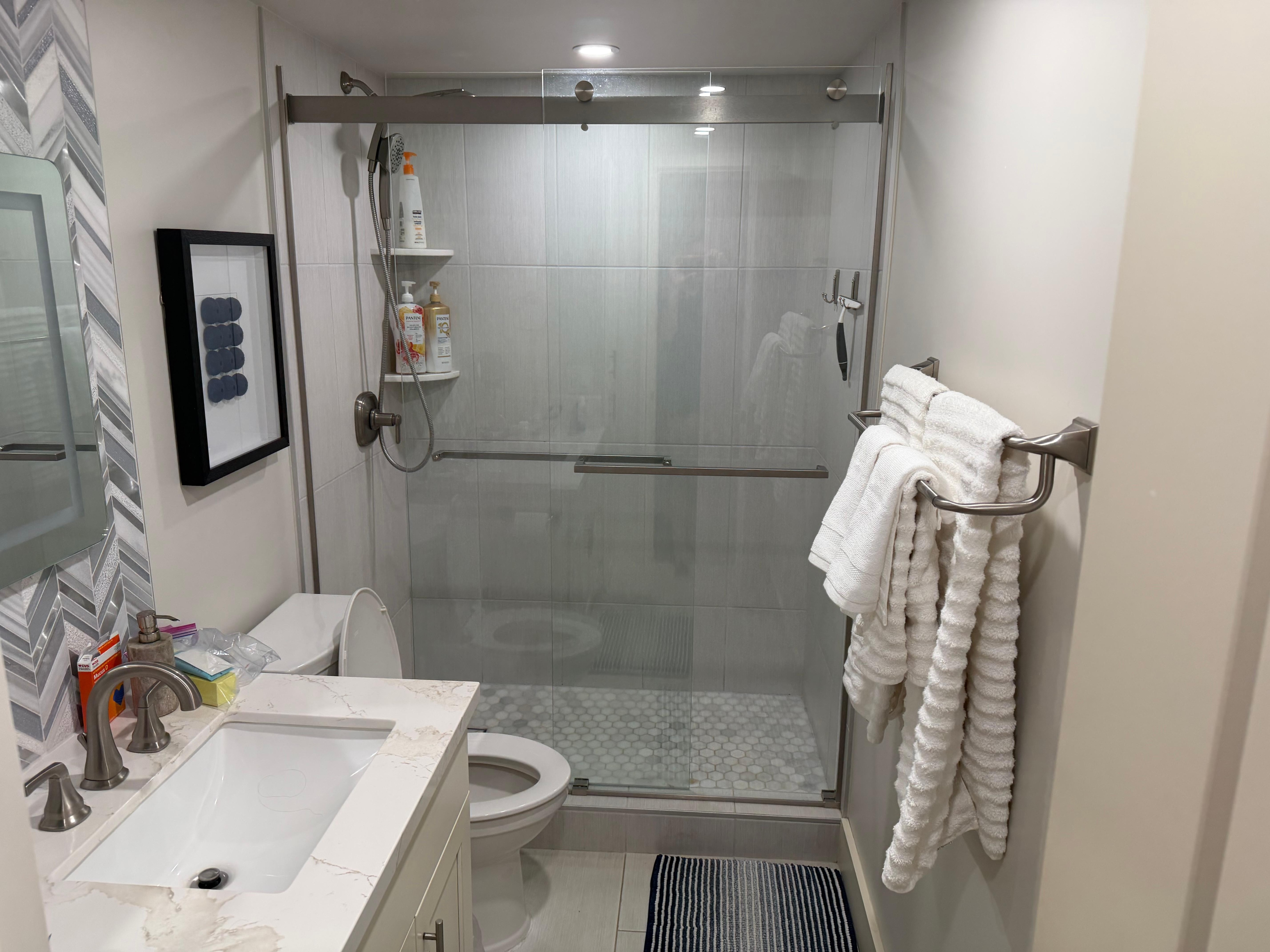 After a day at the beach you will enjoy the custom designed bedroom complete with a king bed. Leave the barn door open to hear the ocean or close it for privacy. The fully stocked kitchen features brand new stainless steel appliances, quartz countertops, and a breakfast bar. Not a detail has been overlooked! The living area includes a memory-foam, comfortable pull-out sofa facing your 55” Smart TV.