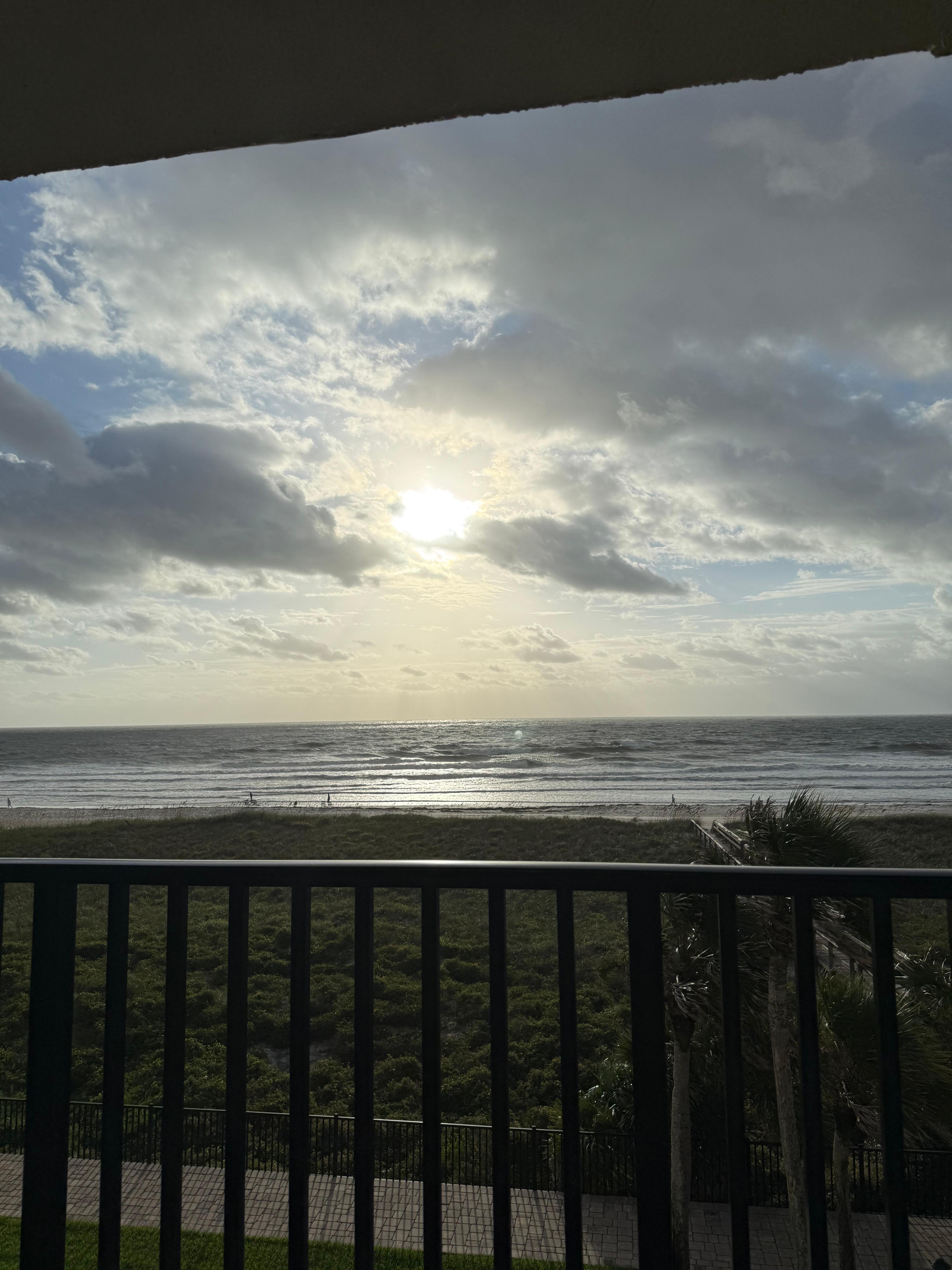 The beautifully decorated living space is furnished with a comfortable sleeper sofa and two upholstered chairs looking out at the expansive oceanfront views. The wall mounted flat screen smart TV provides indoor entertainment. Stylish plantation shutters and blackout draperies offer light control and privacy as needed. This space is anchored by the ocean front sliding glass doors which lead to the spacious covered balcony. Being an end unit, this balcony provides magnificent beachfront views all down the Atlantic coastline. The balcony features a dining table and six chairs perfect for dining alfresco. Two cozy rocking chairs make this the perfect place to watch the waves crash on the shore below or look for dolphins in the horizon!