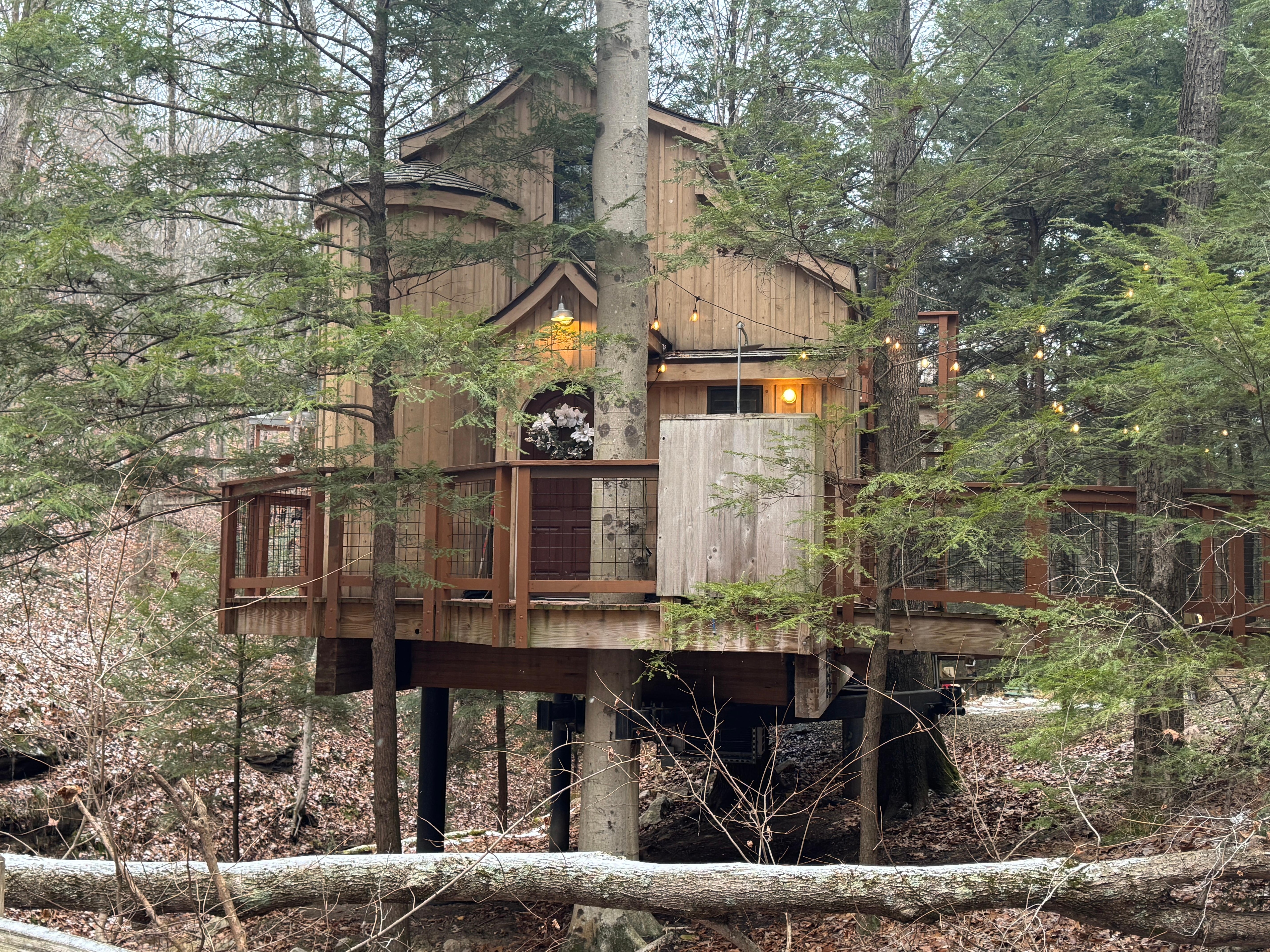The Beech Treehouse is the perfect retreat for rest, relaxation, and reconnection surrounded by nature. Features a spiral staircase leading to the upstairs bedroom, bathroom with shower, kitchenette, living room, electric fireplace, wood-fired hot tub, fire pit, grill, seasonal outdoor shower, and wrap-around deck to enjoy wooded views.