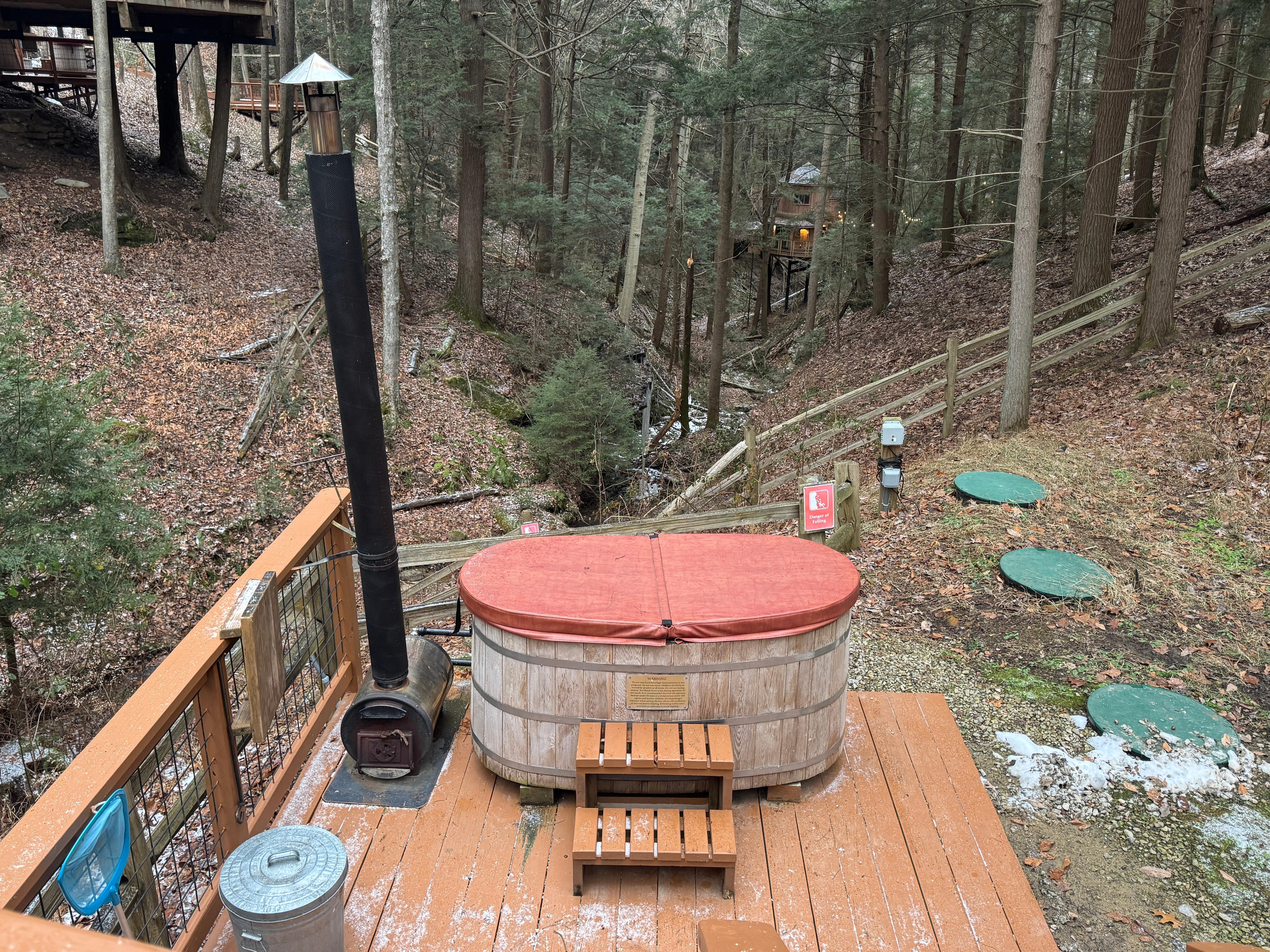 Outside: charcoal grill, grill tools, charcoal, lighter fluid, lighter, fire pit set with extra wood, outdoor seating areas, wood-fired hot tub, additional firewood available onsite for purchase