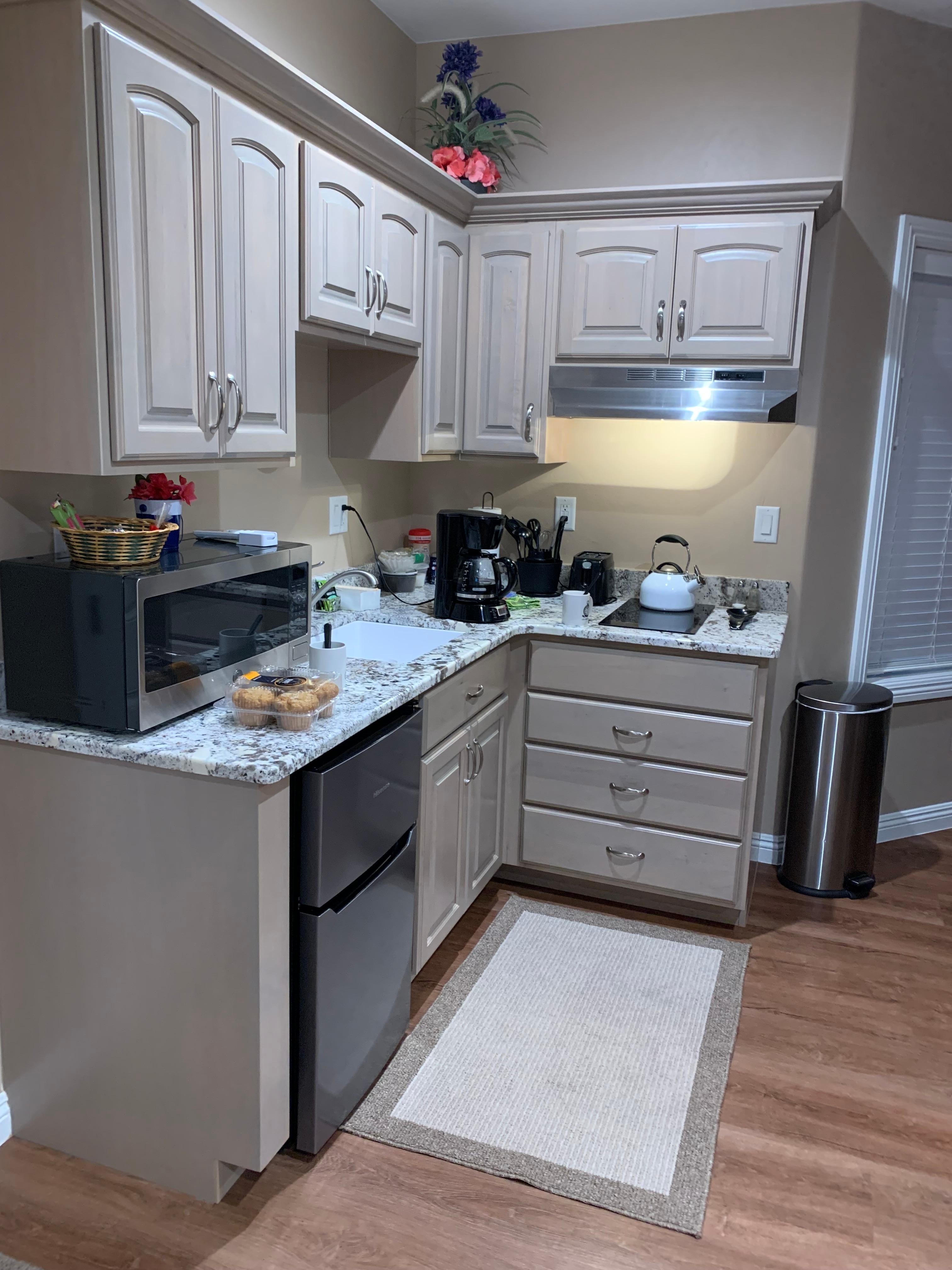 Newly built guest suite close to downtown with beautiful views surrounding the property. Perfect for a romantic getaway. Private front entry with parking space. Courtyard with Bistro Table. Queen size bed, sitting area, large flat screen TV, full bath, heat and air conditioning. Kitchenette has a spacious nook with table and chairs, 2-burner cook top, microwave, mini refrigerator with freezer, coffee maker, toaster, dishes, flatware, pots and pans. Small pet ok with approval.