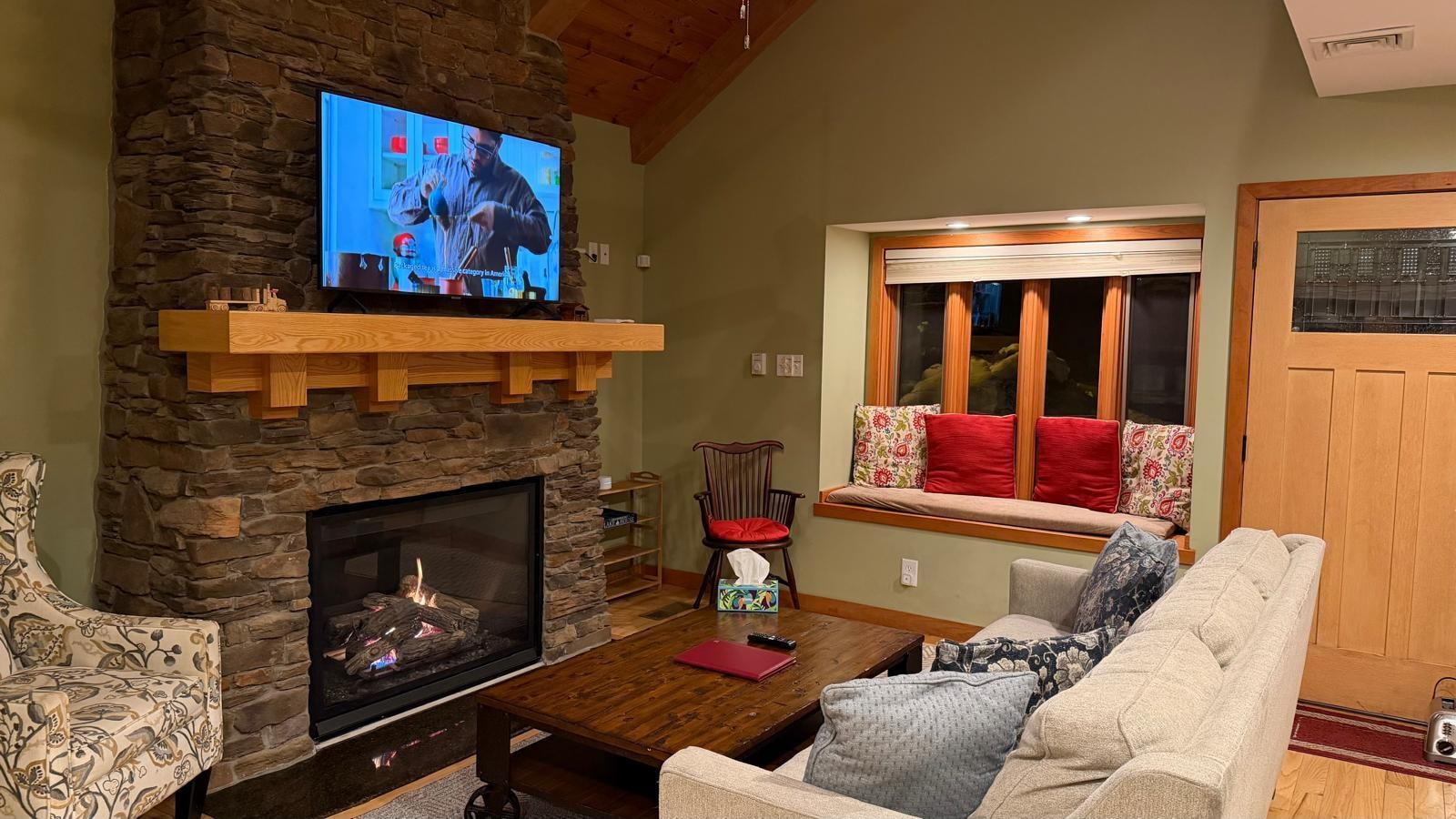 • Seating area (huge sectional sofa, coffee, end table) with TVs, fireplace and Bluetooth speaker