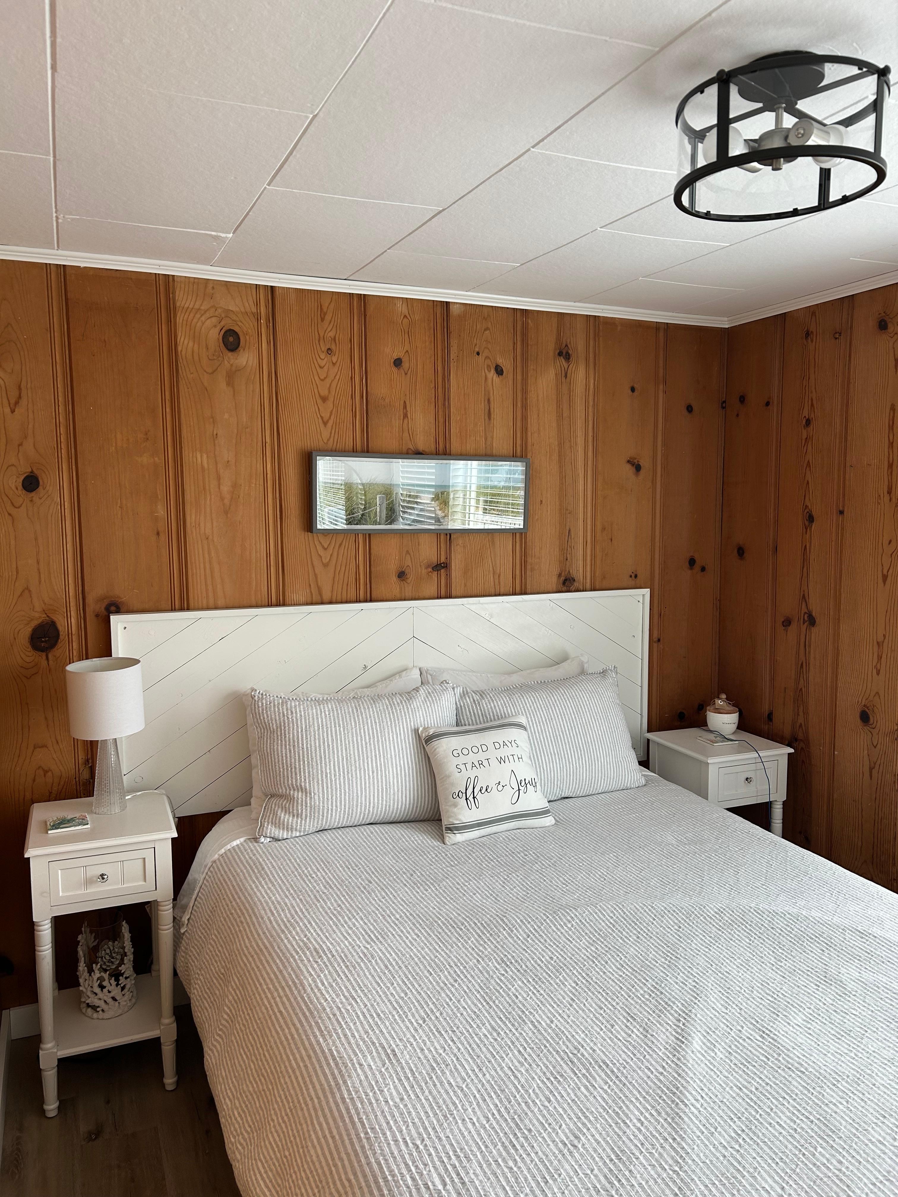 Down the hall between the master and bunk bedrooms, through the door, and a few steps up to the loft unit is a queen bed and 2 twin beds. Down the spiral staircase of the loft unit is a cozy area with a pull out queen sofa, table, large screen tv, bathroom/shower, and kitchenette. The kitchenette has a small refrigerator/freezer, sink, microwave, single cup kuerig, induction burner and an Oster 10-in-1 countertop toaster, bake, air fry, slow cook, broil, roast, warm, pizza, dehydrate & convection oven. Pots & pans for induction burner in kitchenette cabinet. In the closet is a duvet covered comforter and sheets for the queen sofa pull out bed.