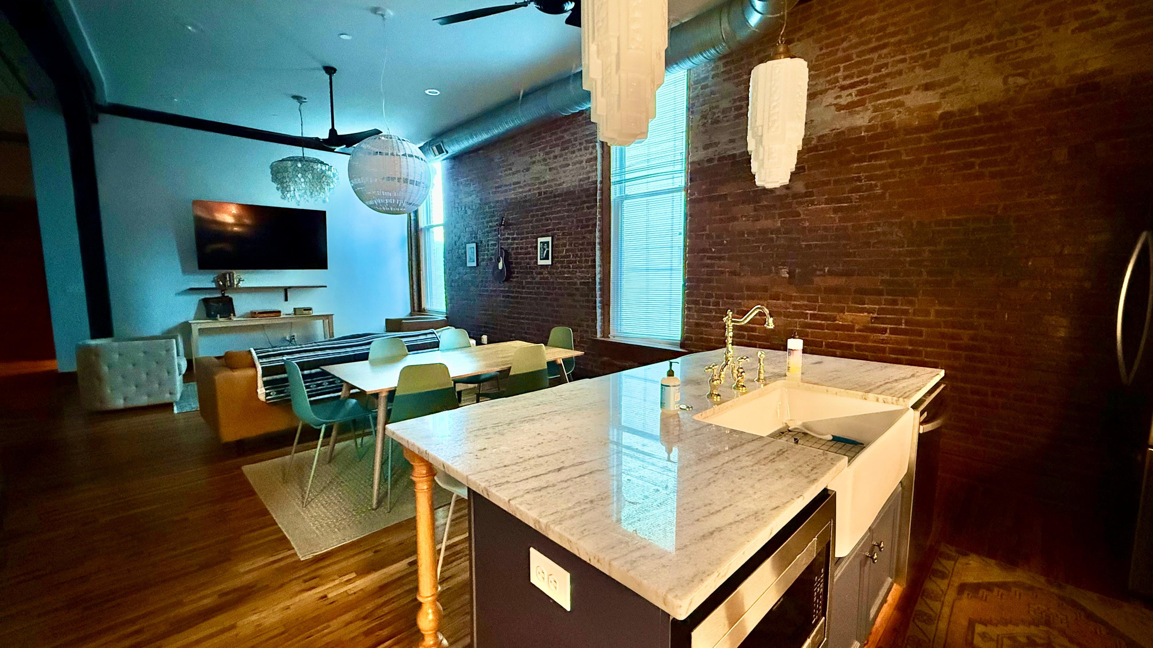 75” tv in main room, 55” tvs in both bedrooms. Extra large kitchen island with skyscraper pendant lights. Curated Outlaw Country record collection.