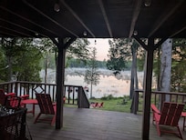 Another set of Glass doors lead to a lower lake front deck with party lights, Adirondack Chairs and another dinning table too!
