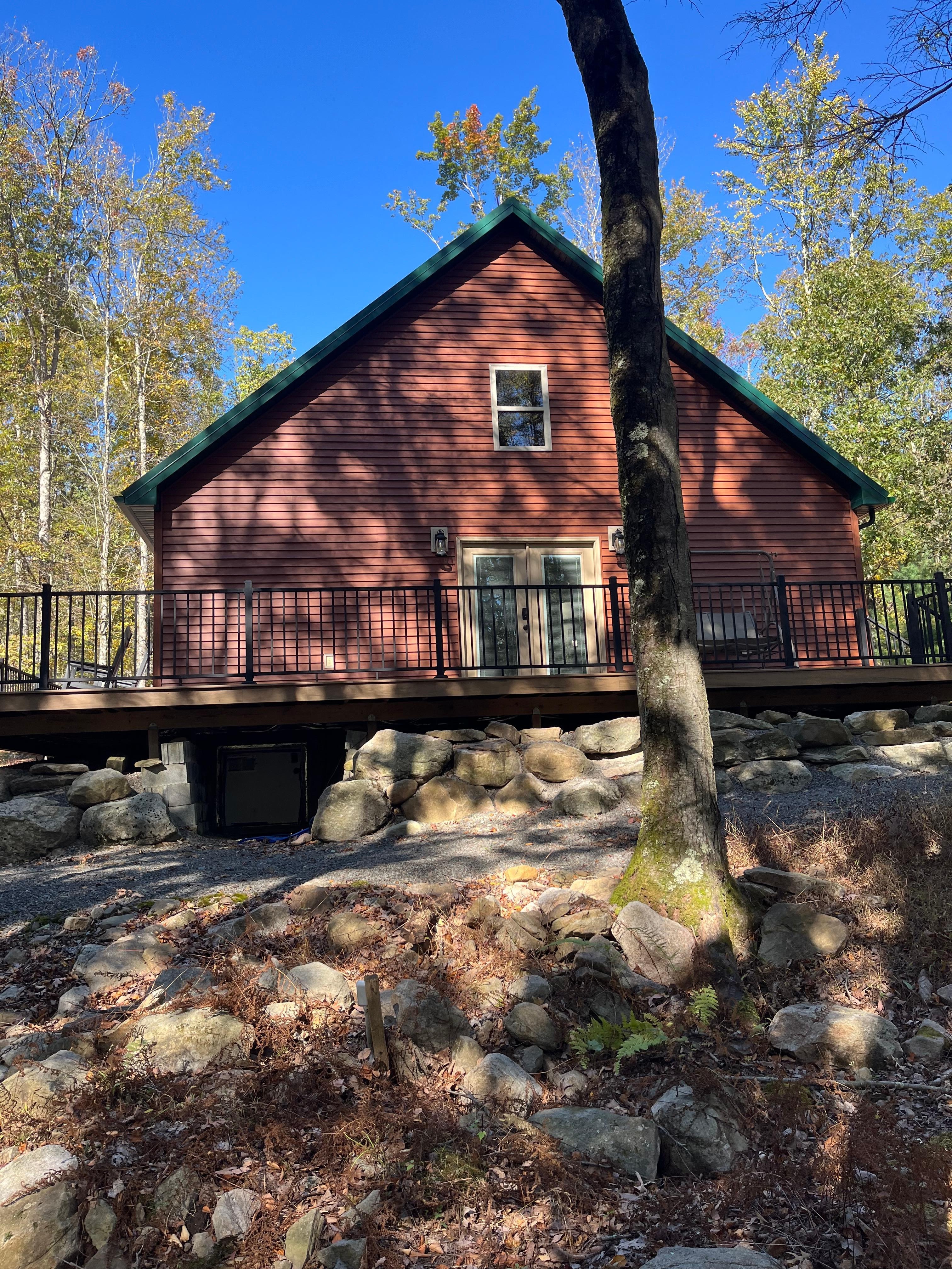 “On the Rocks,” your home away from home. We are happy to share our newly built home with you and are sure you will find peace and tranquility surrounded by our 25 acres of woodlands. Rickett’s Glen State Park, with its beautiful waterfalls and Lake Jean are just a few miles away. Close proximity to PA State Game lands and trails. Very quiet retreat boasting 2 Queen bedrooms and a full bath, with kitchen and living room on the first floor and a loft master bedroom with a King bed and 1/2 bath with private deck. Kitchen is fully stocked with everything needed to prepare meals. Includes a variety of cookware, all cooking utensils, baking dishes, table service for 8, microwave and toaster oven and automatic coffee pot. The wrap-around deck with 4 rocking chairs is a perfect place to enjoy the scenery or hang out with loved ones. The home is equipped with a whole house generator in case of power outage.