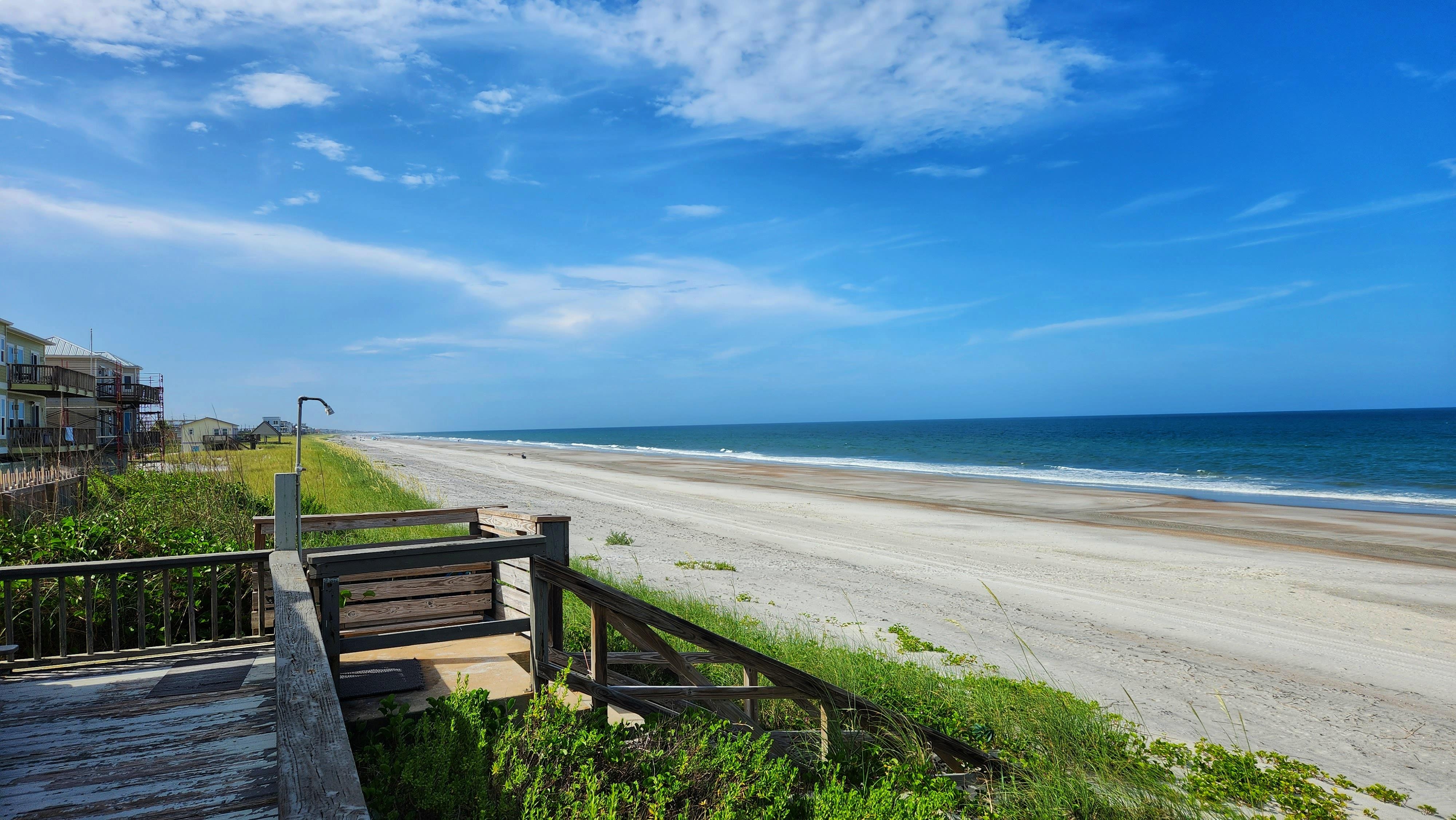 SPECTACULAR 1955 MID CENTURY MODERN OCEANFRONT COTTAGE SECOND TO NONE, JUST BRING YOURSELVES, LOADED KITCHEN AND BEDROOMS, WASHER/DRYER, GARAGE with TESLA charger, OUTSIDE PANORAMIC OCEANFRONT DECK WITH SPIRAL STAIRWAY TO ROOF TOP UNBELIEVABLE VIEWS OF OCEAN AND MARSH, PRIVATE STAIR STEPS TO DIP YOUR FEET IN THE OCEAN. GREAT WITH THE KIDS OR JUST RELAX. ONLY 5 MINUTE DRIVE TO DOWNTOWN.