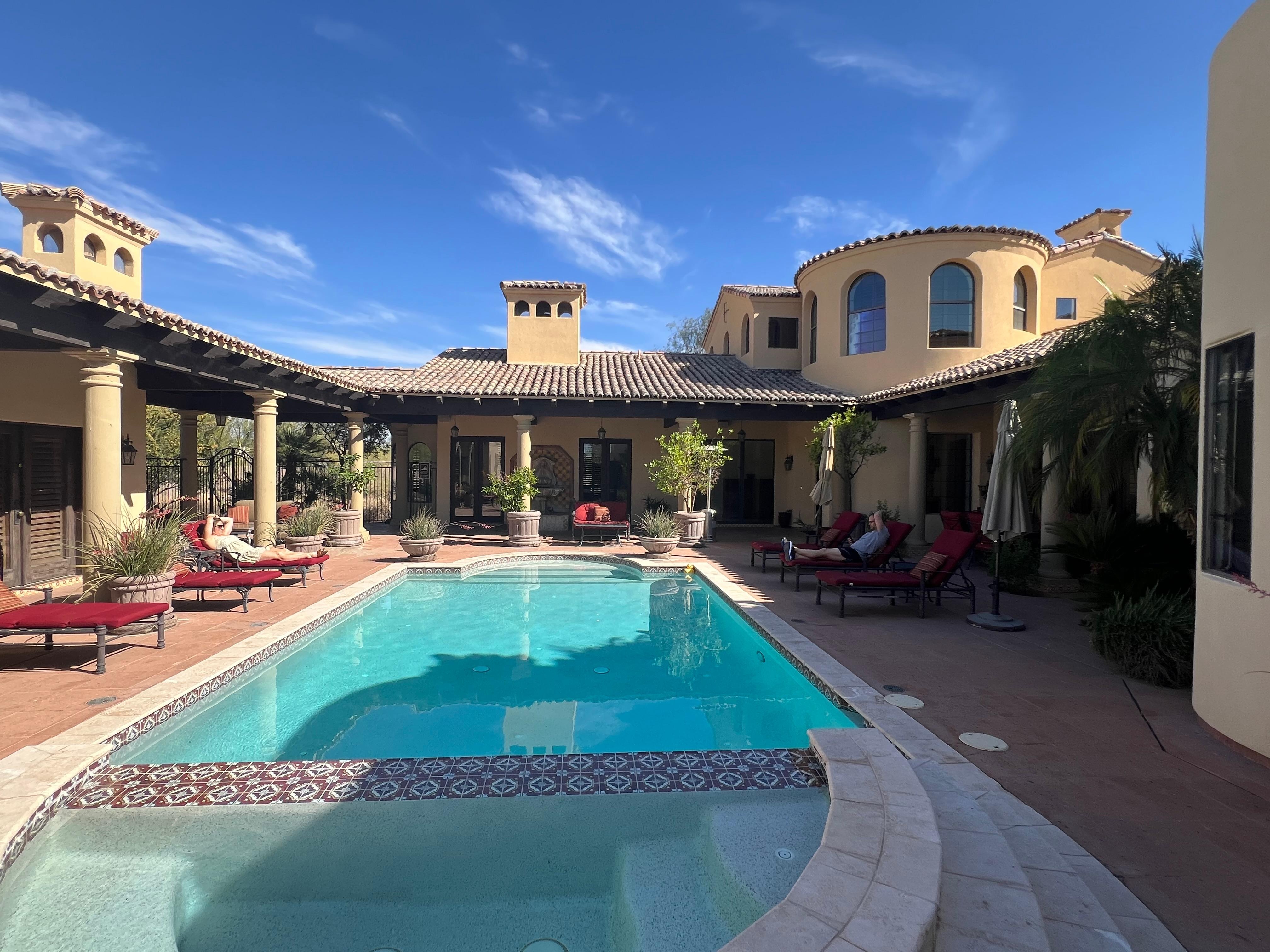 Villa Solare welcomes you to Scottsdale! This beautiful, authentic Tuscan villa offers two privately gated acres of desert splendor just 3 minutes from the Troon Golf Courses in north Scottsdale. Built for entertaining, the central courtyard features a heated pool and spa, Italian-tiled fountain, outdoor fireplace, built-in BBQ, putting green to fine tune your golf game, surround-sound stereo and designer furniture for soaking in the sun or dining al fresco.