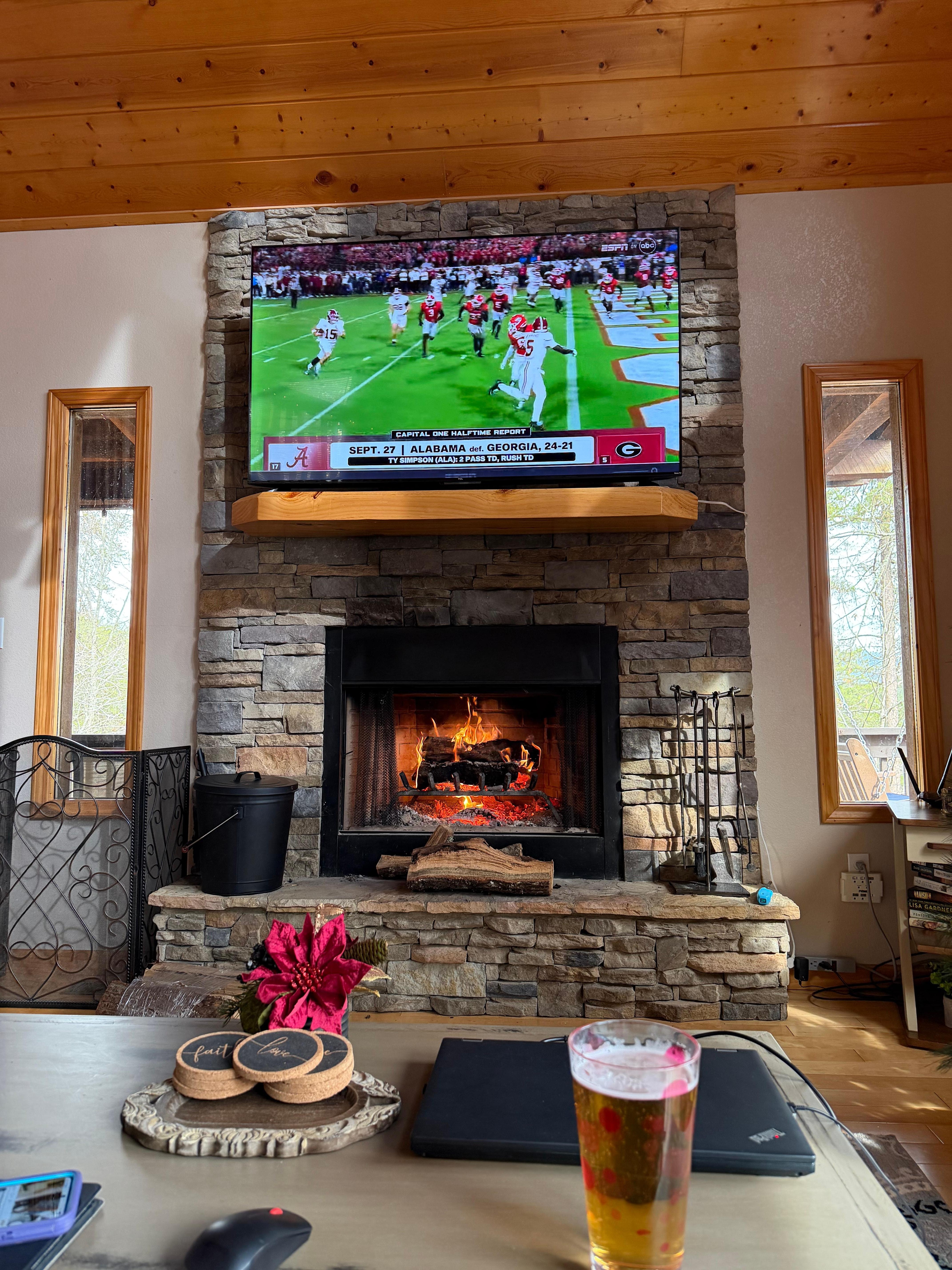 The lower level of the cabin is a paradise for entertainment enthusiasts. Engage in friendly competition around the pool table, sip your favorite beverages at the mini bar area, and catch up on sports events on the large TV screen. It's an oasis for relaxation and enjoyment. Walk out from this level to a deck to enjoy the view or enjoy a cocktail sitting on the bar table.