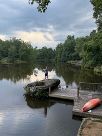 The deck off the back of the house overlooks the peaceful, private lake. Down by the water is a fishing dock with kayaks. Test out your climbing skills and boulder around the giant rock at the dock. Enjoy the luxury of turning on the waterfall to the adjacent rock. (Enjoy all outdoor activities at your own risk.)