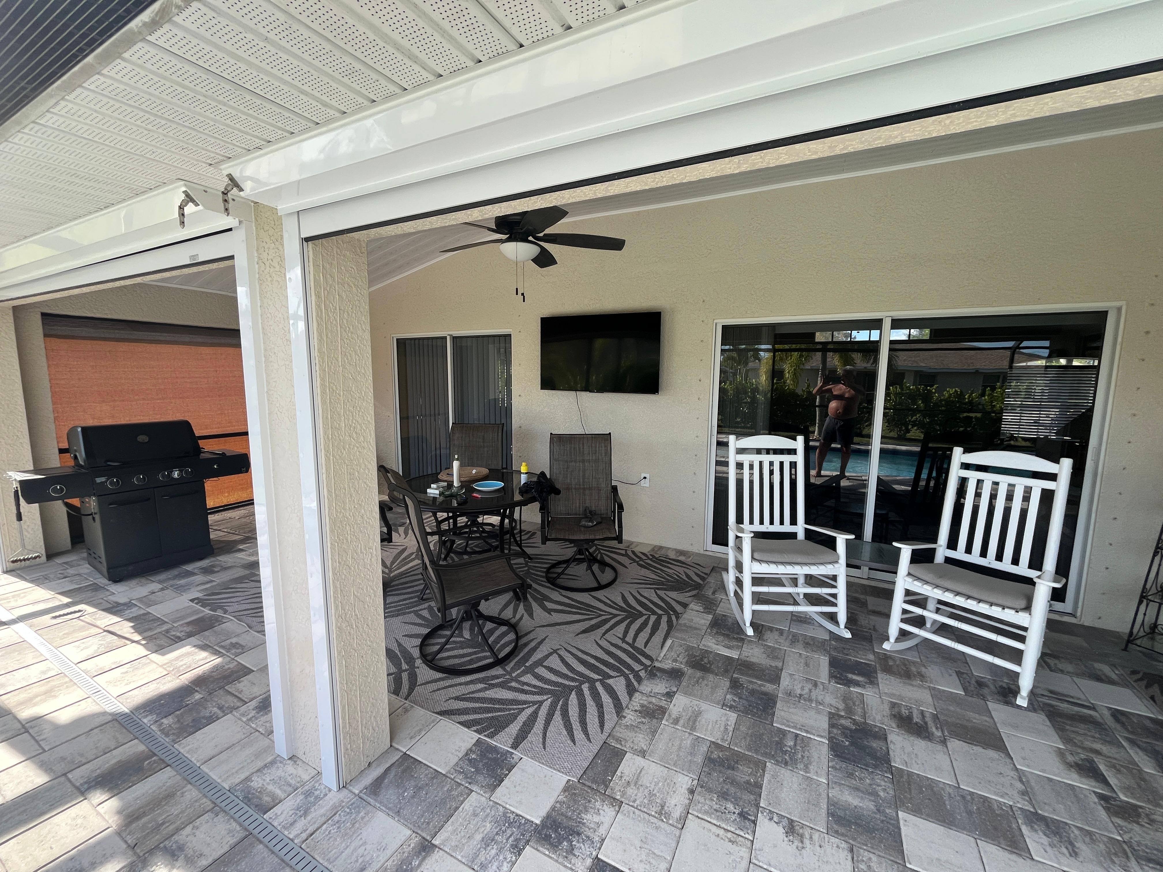 Enjoy our southern-exposure lanai, featuring a heated saltwater pool and shaded area for relaxation. This outdoor space is perfect for entertaining, complete with a gas grill, outdoor TV, dining table and ample seating within a screened-in pool cage—your ideal outdoor living room!
