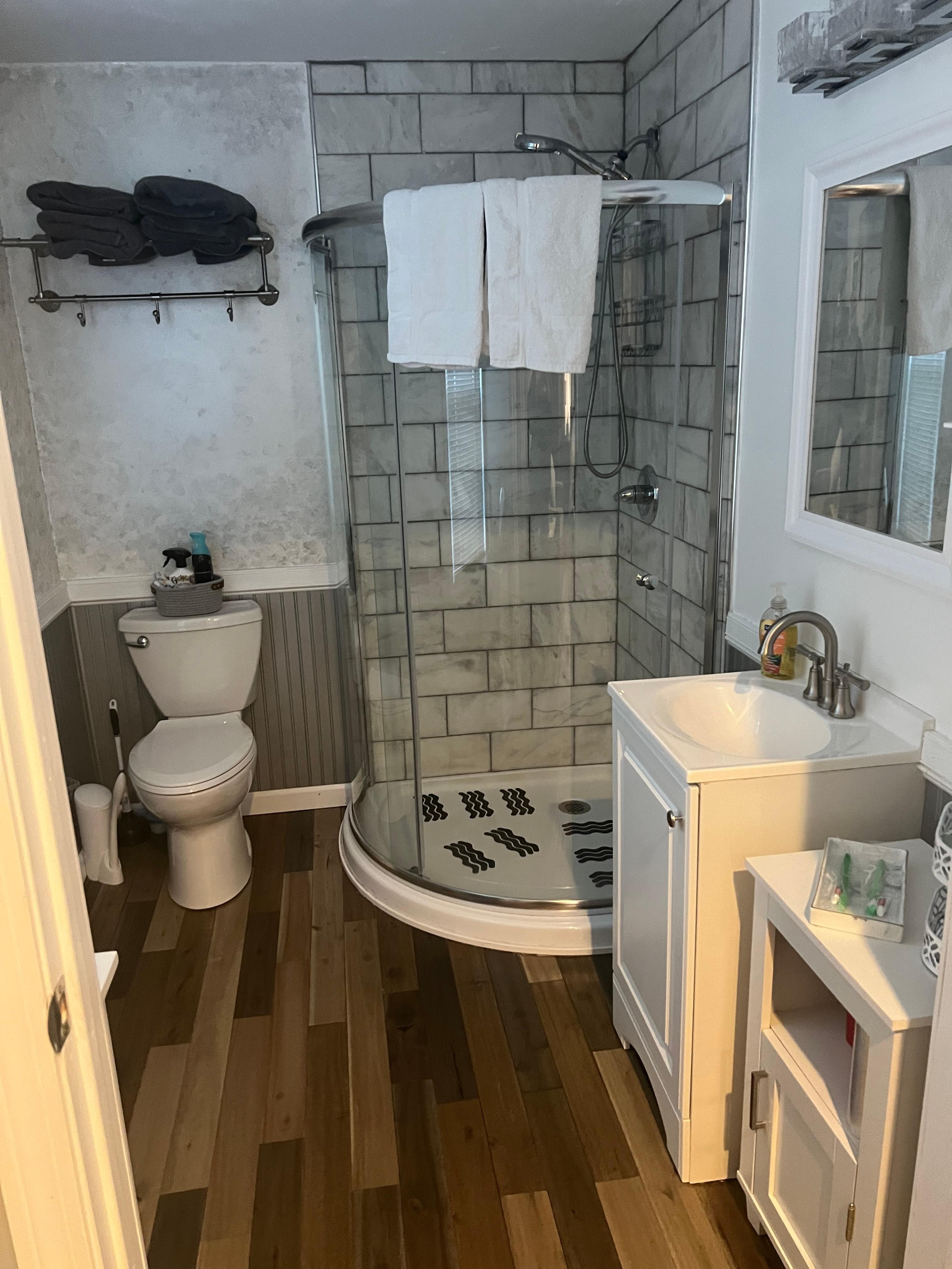 Please put any wet towels in the bag provided under the bathroom sink or hang behind the bathroom door. Please do not leave wet towels on the floor.