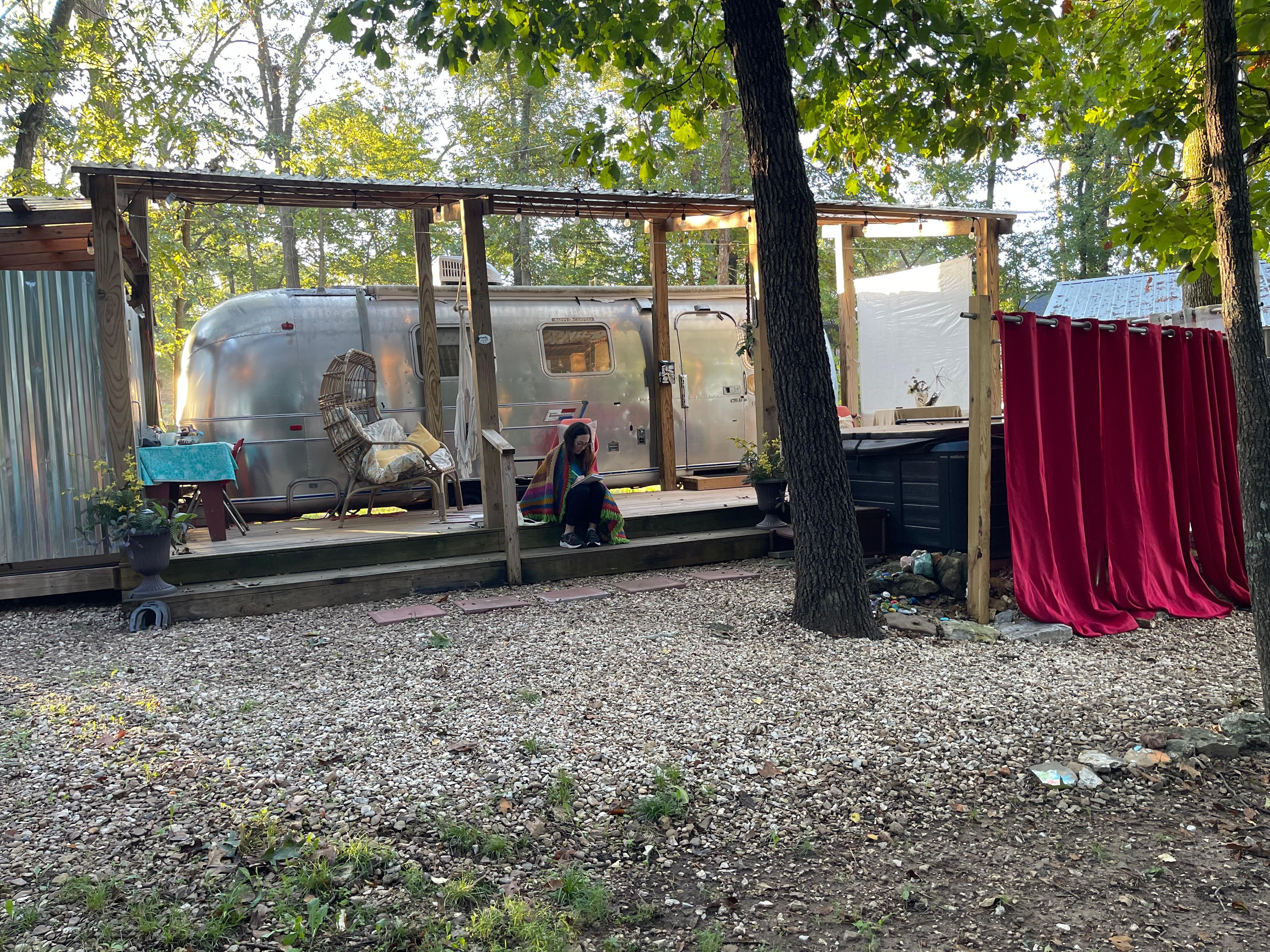 Your area includes the Airstream trailer, covered deck, your own fire pit, an outdoor theater, exclusive hot tub, outdoor kitchen, outdoor dining and outdoor shower.
