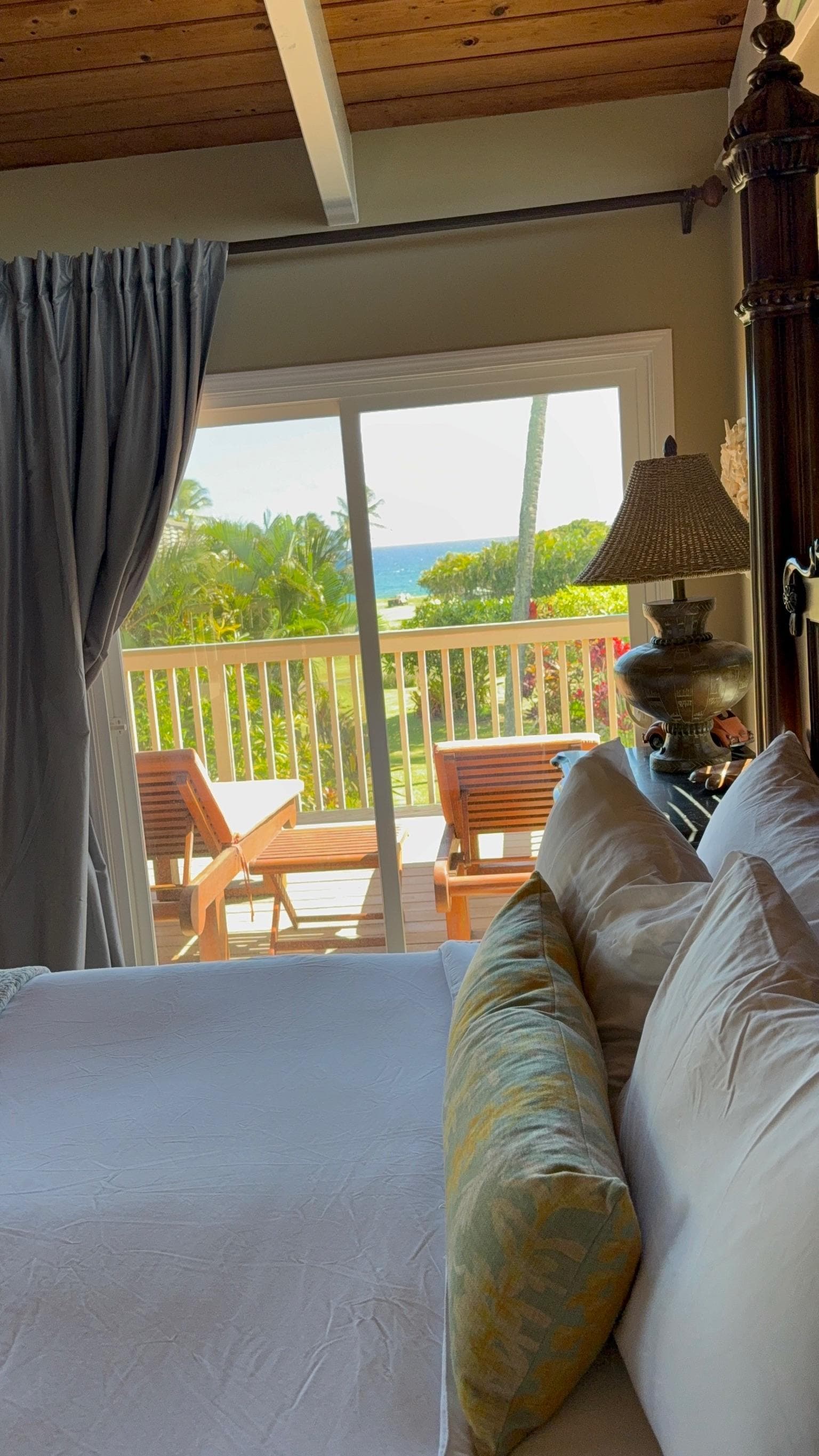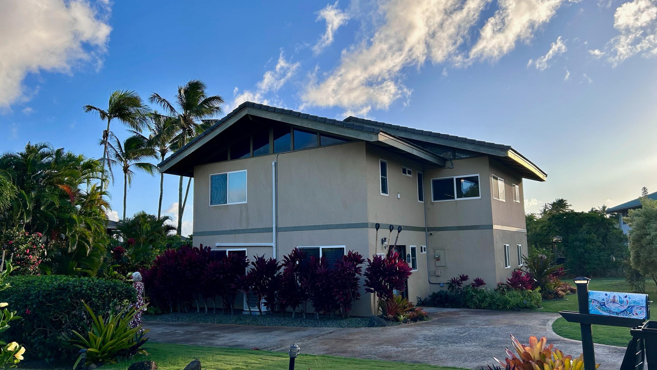 THE HOME: Hale Poipu is a two story home on a large private lot on a quiet cul-de-sac. The heart of the home is the great room upstairs. The great room has an open-plan living, kitchen and dining room. The comfy sectional sofa has a pull out double mattress. On either side of the great room are two matching Cal King master bedrooms, each with identical square footage. Both upstairs bedrooms have quality mattresses, flat screen TVs, en suite bathrooms, and each space is equipped with its own quiet air conditioning unit for personalized comfort. All upstairs spaces feature sliding doors leading to the lanai for seamless indoor/outdoor living. The lanai has a 48” DCS gas grill, a teak dining set, a covered conversation seating set, and 3 lounge chairs. Downstairs there is a separate Ohana studio with the identical square footage as each of the 2 upstairs master bedrooms. It has 2 twin beds and a queen bed. The Ohana unit is equipped with a full kitchenette, laundry & bathroom, and quiet split air conditioning. It has private entrances, the front door facing the street and 8' sliding door facing the backyard driveway. The doors to the Ohana unit downstairs do not connect internally to the upstairs part of the main home, and is only accessed from outside. This separate living area may be perfect for teens or in-laws seeking some privacy. The downstairs covered patio area has an outdoor shower, bench swing & 6 seat patio dining set for enjoying the private yard with an ocean view. Although the upstairs and downstairs living areas are separate, the property is exclusively rented as a full 3 bedroom, 3 full bathroom home, not separately.