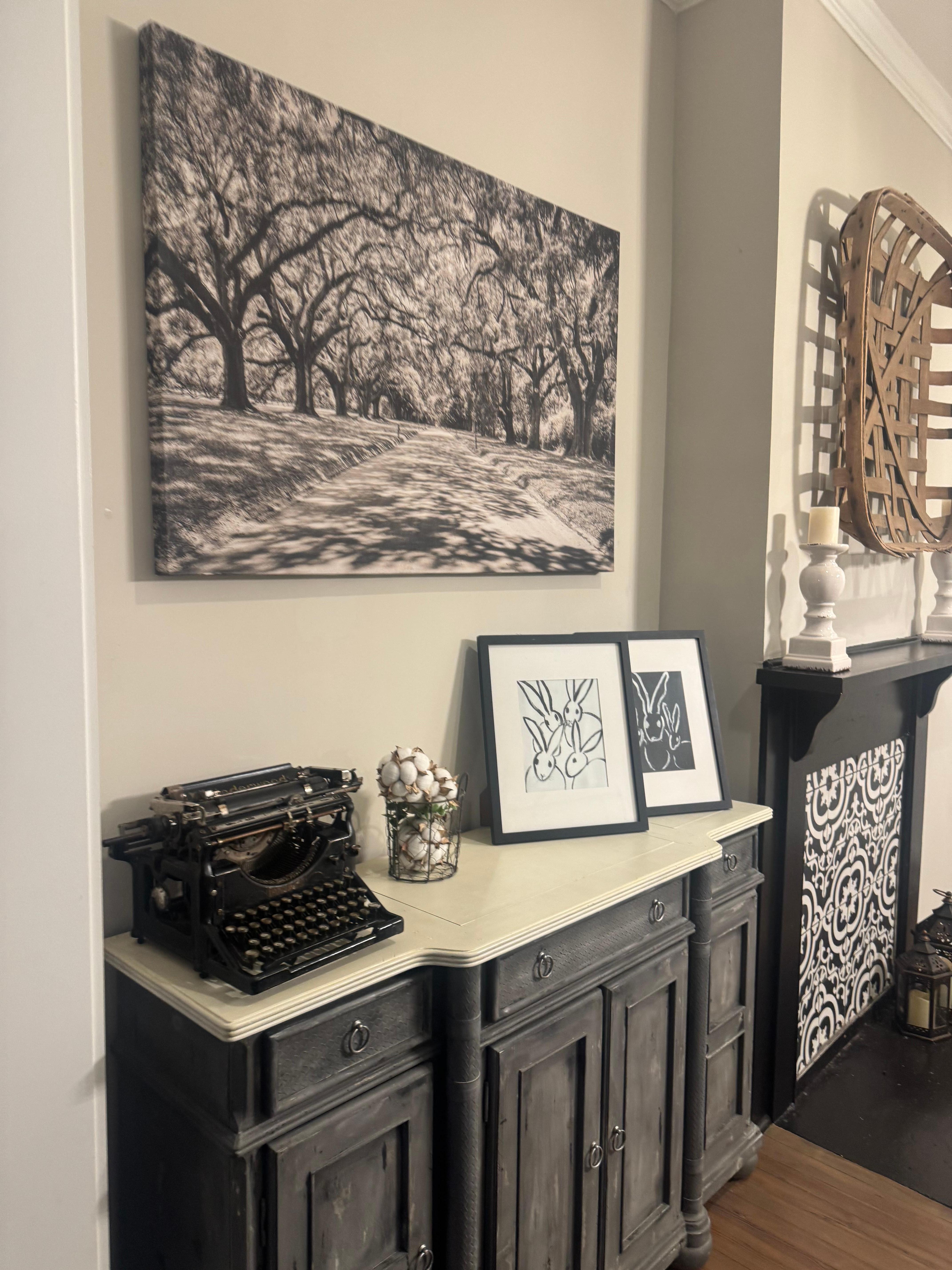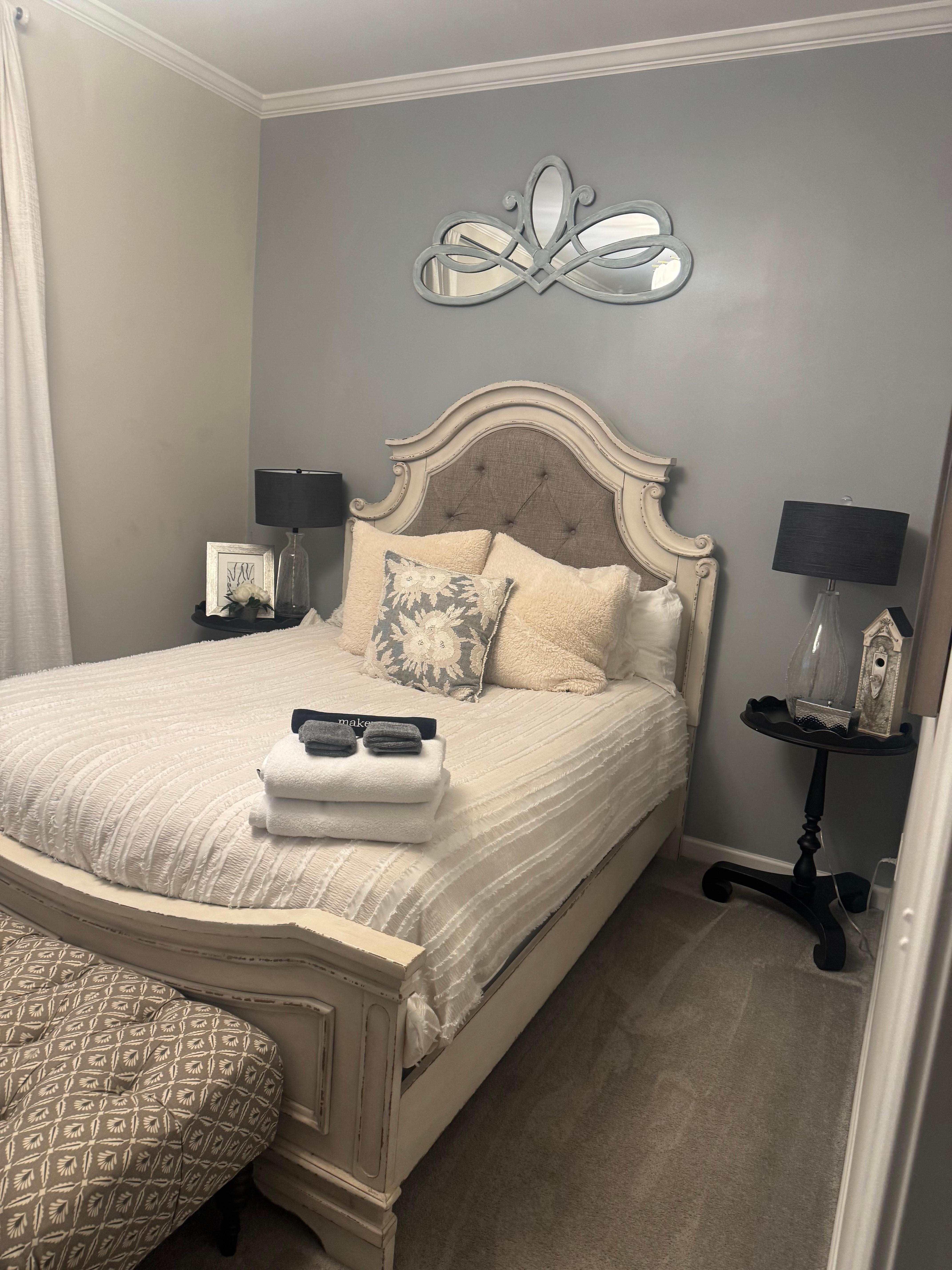 The Gray Bunny Room: The elegant room features a queen size bed, 2 night-stands, bench and lamps, closet as well as a beautiful non-working fireplace.