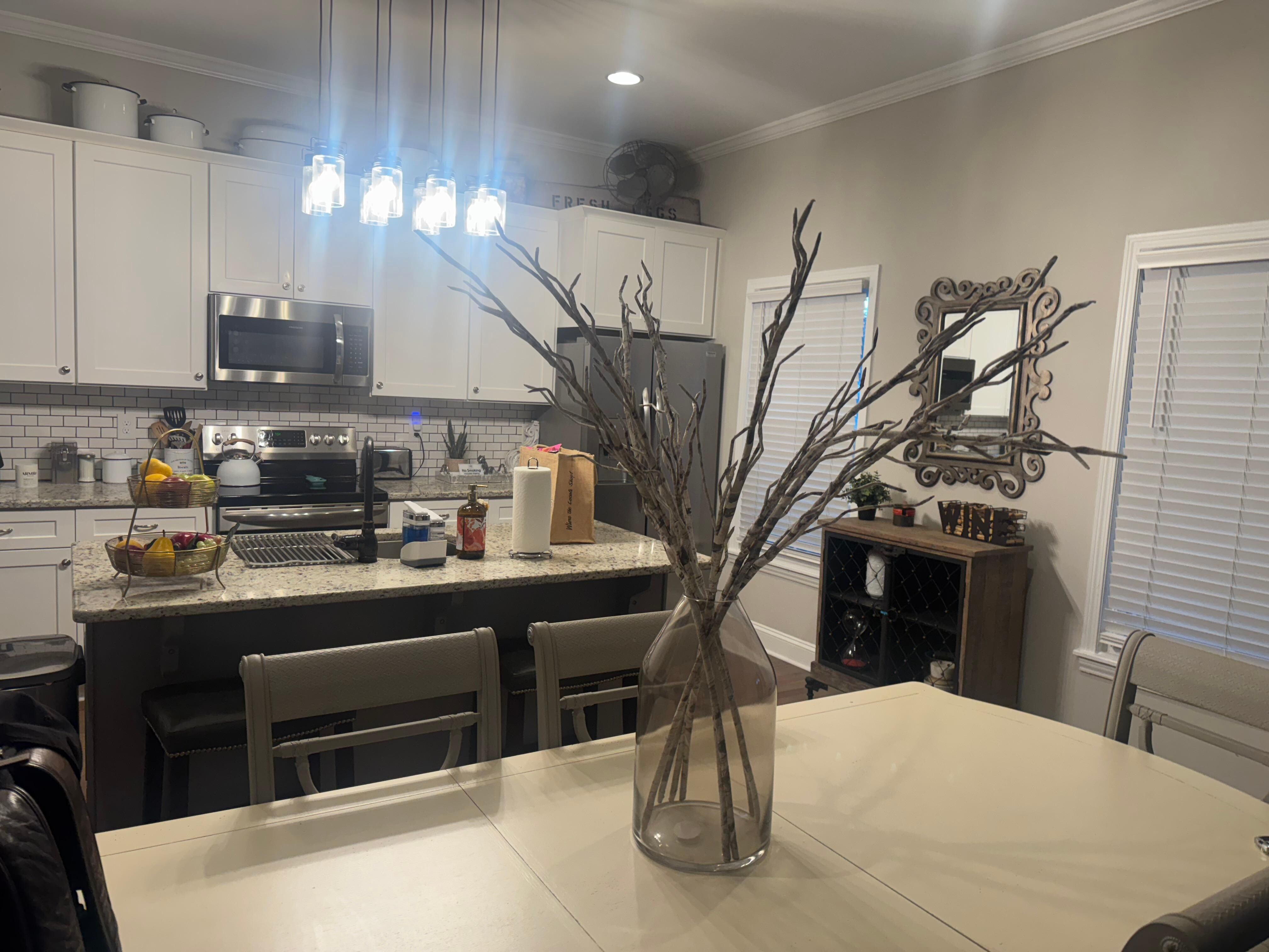 House: 1500 sq ft house with 3 bedrooms 2 baths with a beautiful covered front porch and a fenced in yard with a fire pit. The house has an open concept living room with a large comfortable sectional, 50” smart TV, large dining table and open concept kitchen with an Island.
