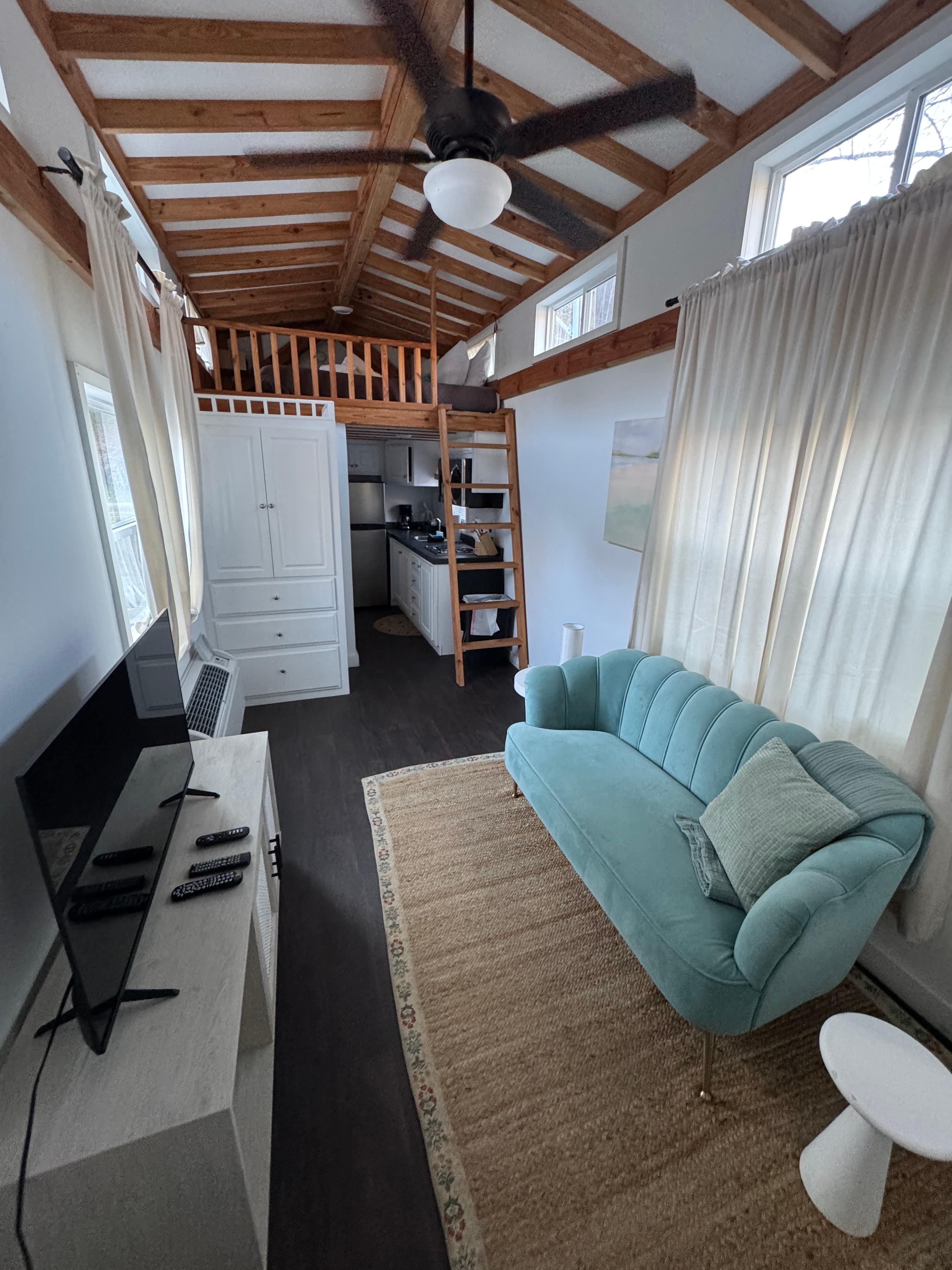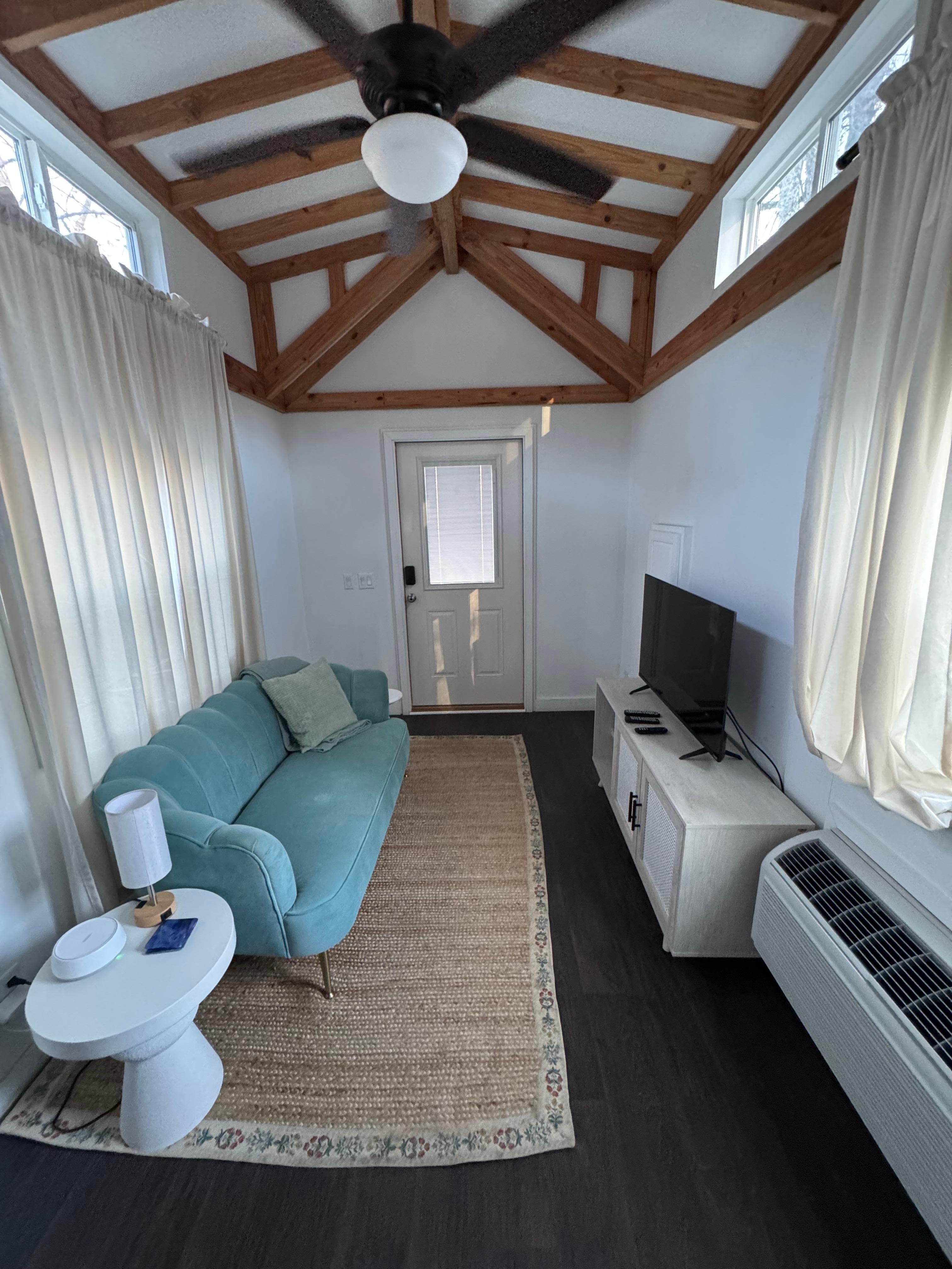 Welcome to Breezy! This chic tiny home is located within Laurel Bush River Cabins Family Campground, right beside the peaceful Tuckasegee River. Wake up to soothing water sounds and enjoy easy access to the breathtaking Smoky Mountains. Spend evenings on the riverfront deck and relax in a comfortable king bed.
