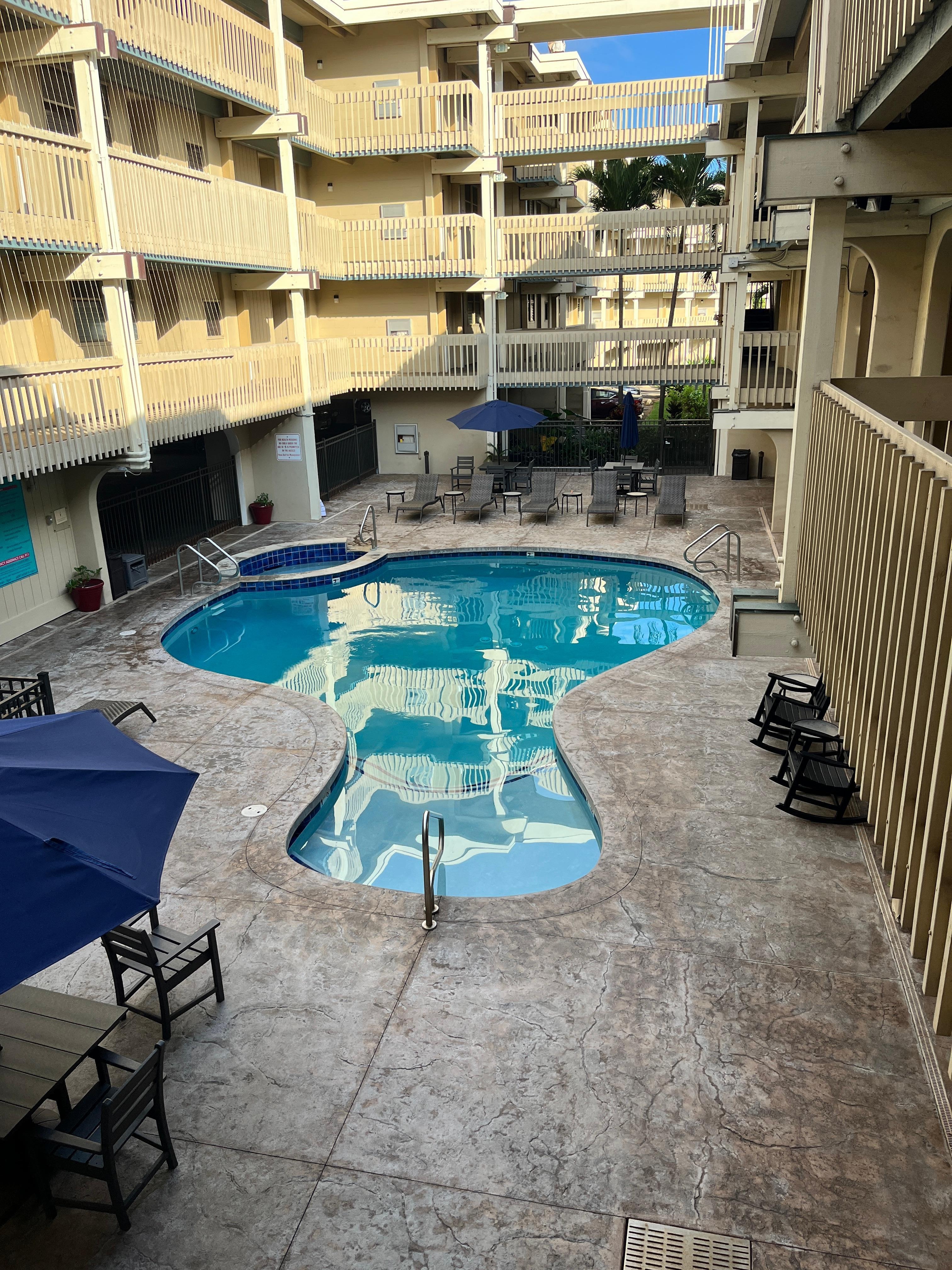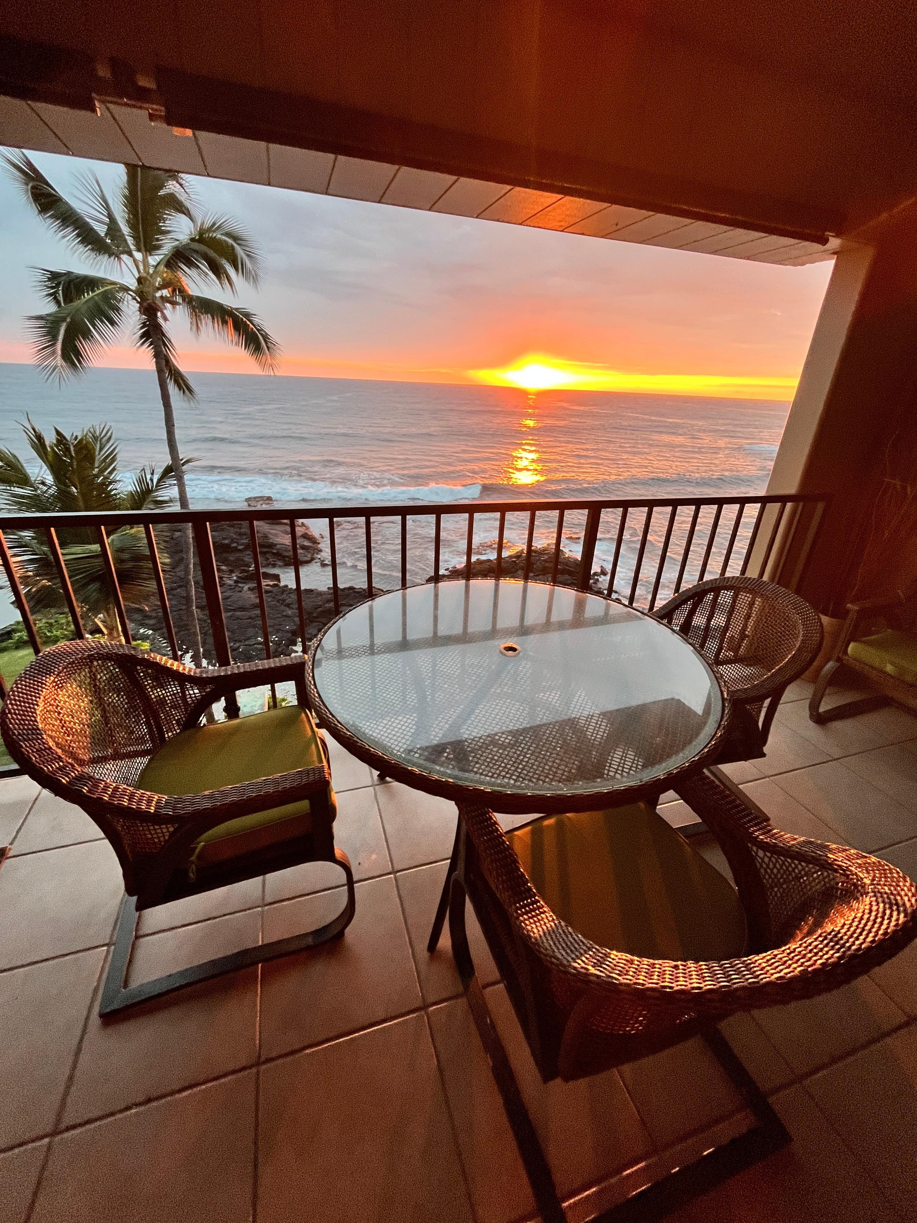 Located on the fourth floor and north-end of a four-story building, this oceanfront condo boasts first-class views as well as excellent proximity to Kona town and all activities. Watch world-class surfers ride the waves while dolphins frolic in their wake. Enjoy seasonal whale watching right from your lanai and get a close up view of the giant sea turtles that come up on shore to sun themselves! (No touching though!)