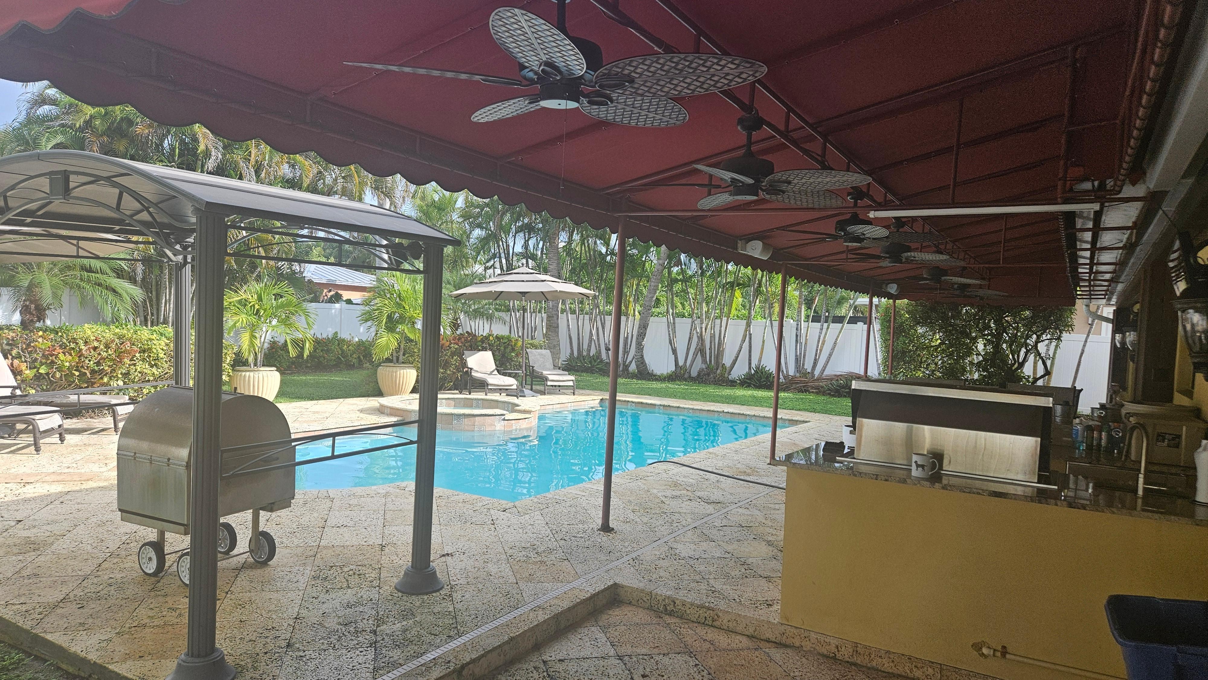 The backyard consists of a Heated Saltwater Pool, Hot Tub, 4 Loungers with Market Umbrellas as well as Pool Floats. There are two outdoor seating area's, compete with comfortable chairs and canopy fans. There is a large dining table with seating for 6 and 2 bar seats. The Outdoor Kitchen has Natural Gas BBQ, Mini Fridge, Ice Machine, Sink, 65" Smart HD TV with Satellite and Outdoor Speakers.