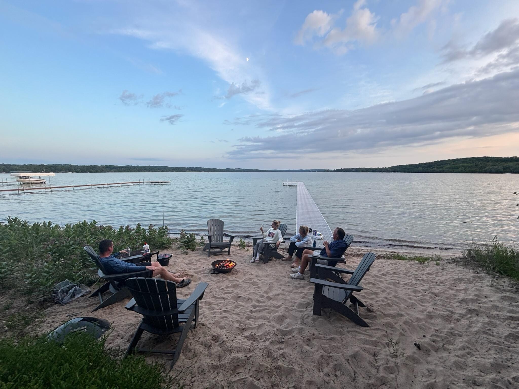 NEW PING PONG TABLE! Have a family and friends competition while visiting this amazing Leland beauty. THE BEST Leelanau Lakefront experience w views, views, views and privacy right on the water. Come stay at Long Dock Cottage. Set deep into the woods on the "coveted North end" of North Lake Leelanau on 125 feet of private lake frontage, this location and beach are considered the best location on Lake Leelanau. Close to Leland yet in the center of all Leelanau County has to offer. A private setting for family and friends to have the sense of getting away from it all yet still close to the village of Leland, Lake Leelanau, Northport, Suttons Bay, or Omena. The cottage has an authentic "up north" Michigan style sought after by guests seeking the true feeling of being away in a modern yet authentic Michigan residence.. It is vintage Leland with a modern style, interior decor, and design aesthetics. Details such as the highest quality all cotton linens, towels, beach towels are considered for guests to enjoy. There are panoramic south views of North Lake Leelanau from the main living spaces and primary bedroom providing both sunrise and sunset experiences. The property setting is wooded yet the cottage is full of light. Guests might sit on the end of dock to meditate with morning coffee, do yoga, and catch the sunrise. Or sit on the patio for late evening sunset over the Manitou Passage on Lake Michigan to the west. Many comparisons are made to the blue, green waters of the Caribbean as crystal clear waters of the shore of North Lake Leelanau are as blue as the Bahamas. The sandy shore offers easy access into shallow waters keeping little ones comfortably swimming and paddling near the shore. the bottom is sandy and easy for wading or quick swims. The long private dock is for guests use only providing moorage for guest's boat buoy/anchor between shore with sandy lake bottom. The cottage has been well cared for and updated to retain the Up North charm and character of an authentic Leland residence. Guests will appreciate the stylish modern cottage decor blended with the Leland Cottage details presenting a cozy, comfortable retreat. The cottage provides (3) full baths and 4 large, comfortable bedrooms (1 king bedroom with en suite bathroom, 2 queen bedrooms, a bunk bed and twin trundle for 2). There is a rinsing station just off the patio for sandy swimmers.