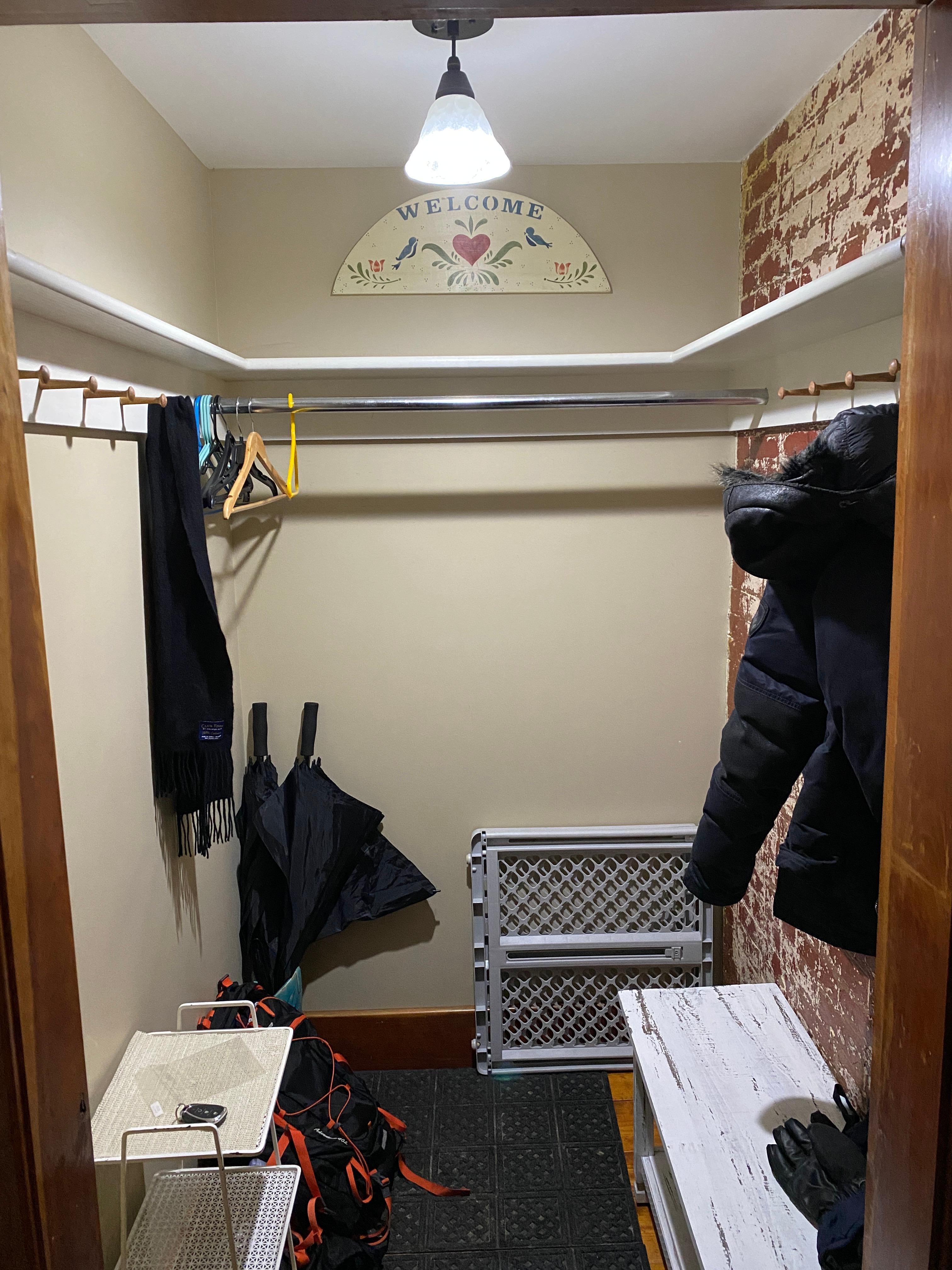 The bedroom on the second floor has a queen bed with new Simmons Comforpedic mattress and box spring. A 20-inch flat-screen TV, as well as a IHome bluetooth wireless docking system with a dual alarm clock, sits on a nine-drawer dresser. There is a large walk-in closet and plenty of finished storage space under the eaves of the building. A washer and a dryer, towels, linens, ironing board and iron are all conveniently located off the bedroom. An air conditioner on each floor keeps this apartment comfortable through an unexpected hot summer and fall.