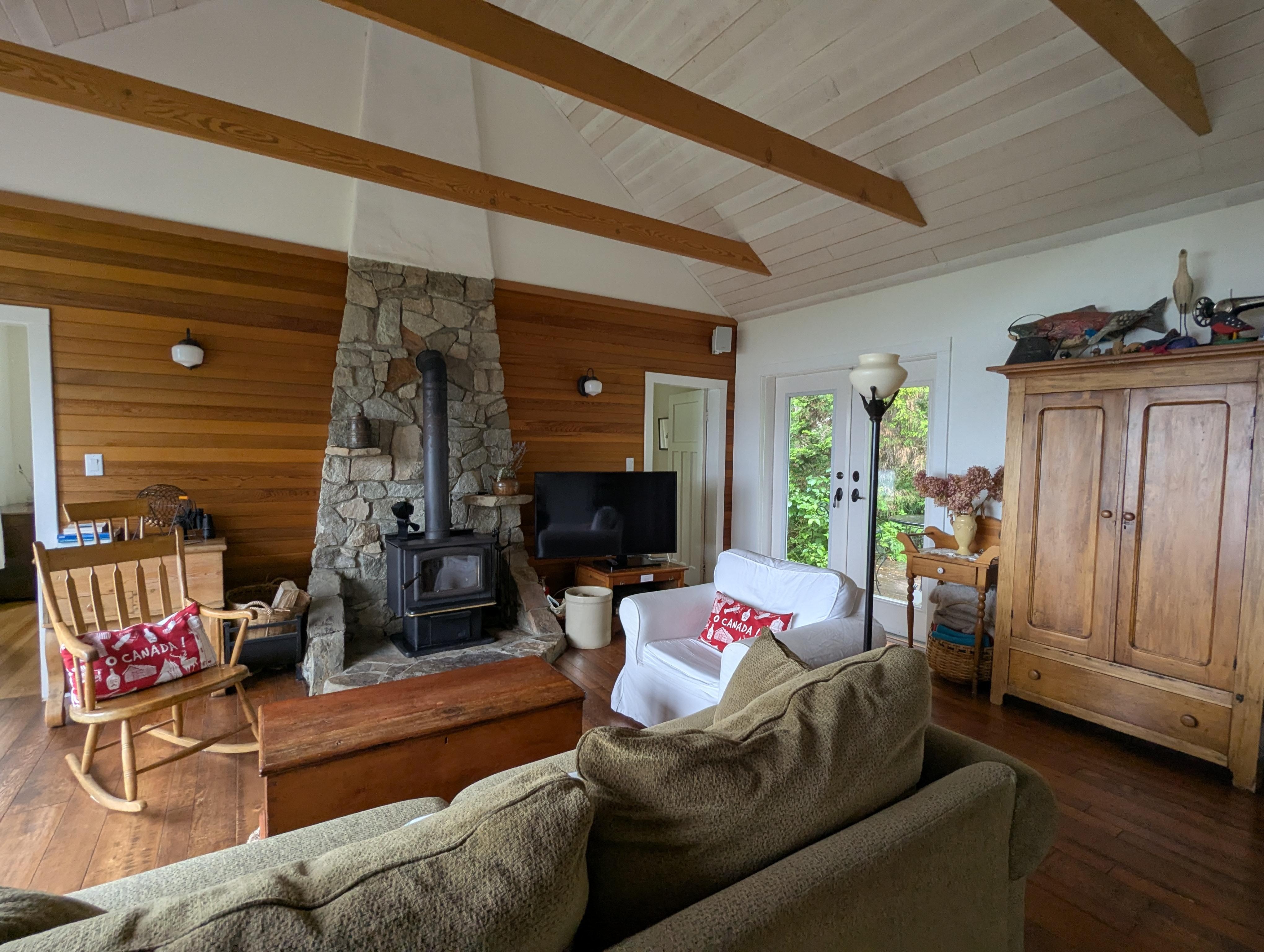 An expansive living room with a vaulted ceiling is furnished with pine Canadiana pieces for your comfort. Books, board games and videos are available to help you unwind and relax or share some laughs. The warmth of the wood burning fireplace will keep you cozy on those cooler days.