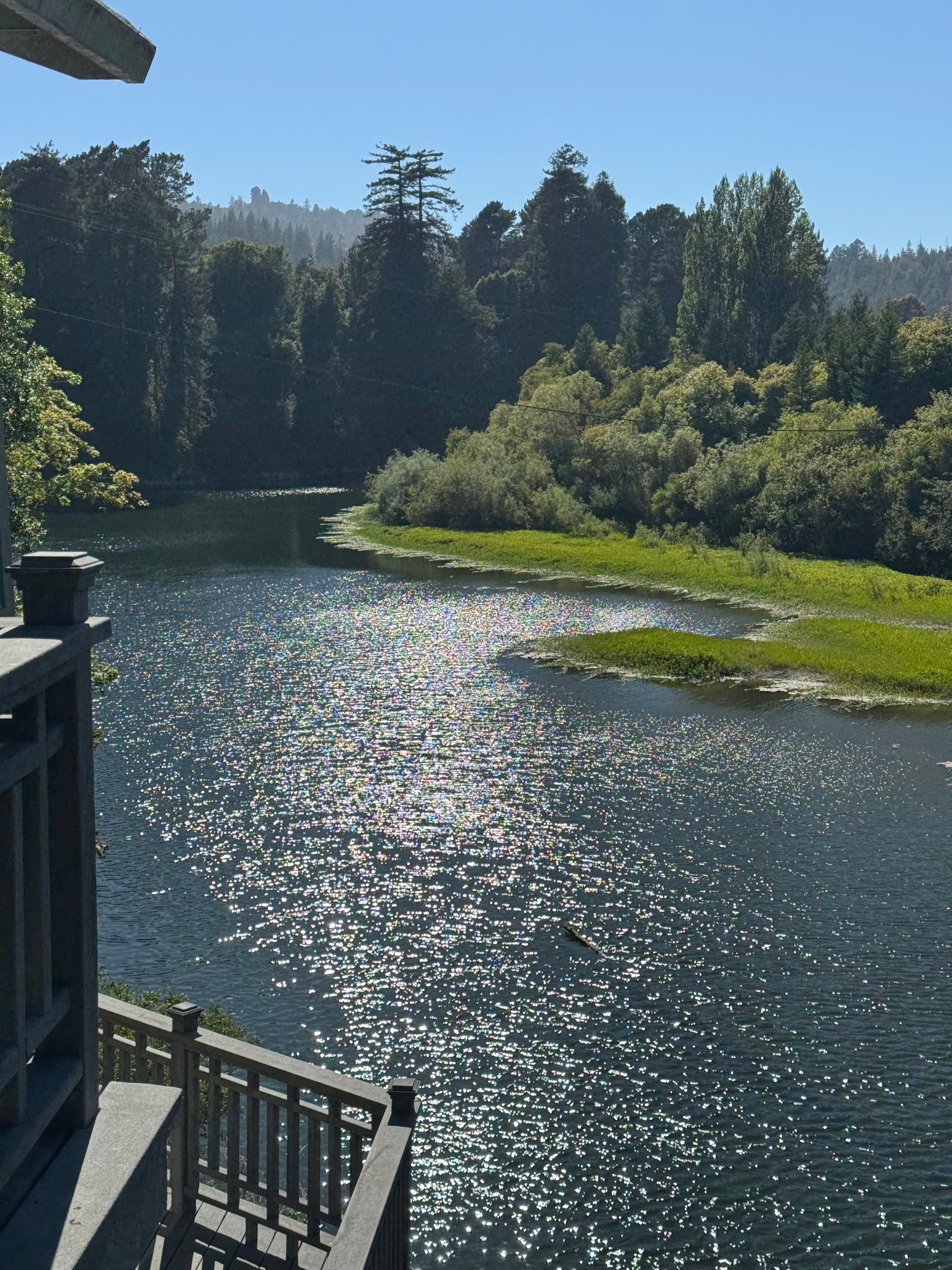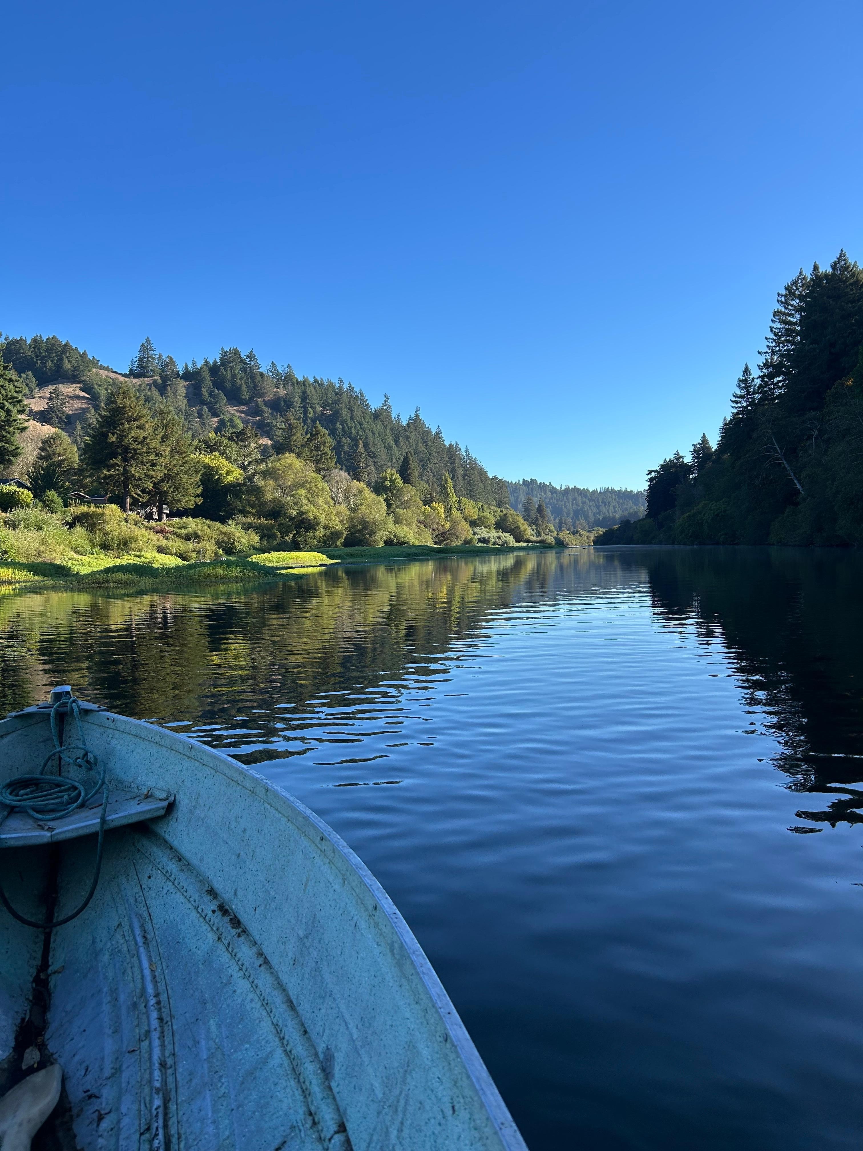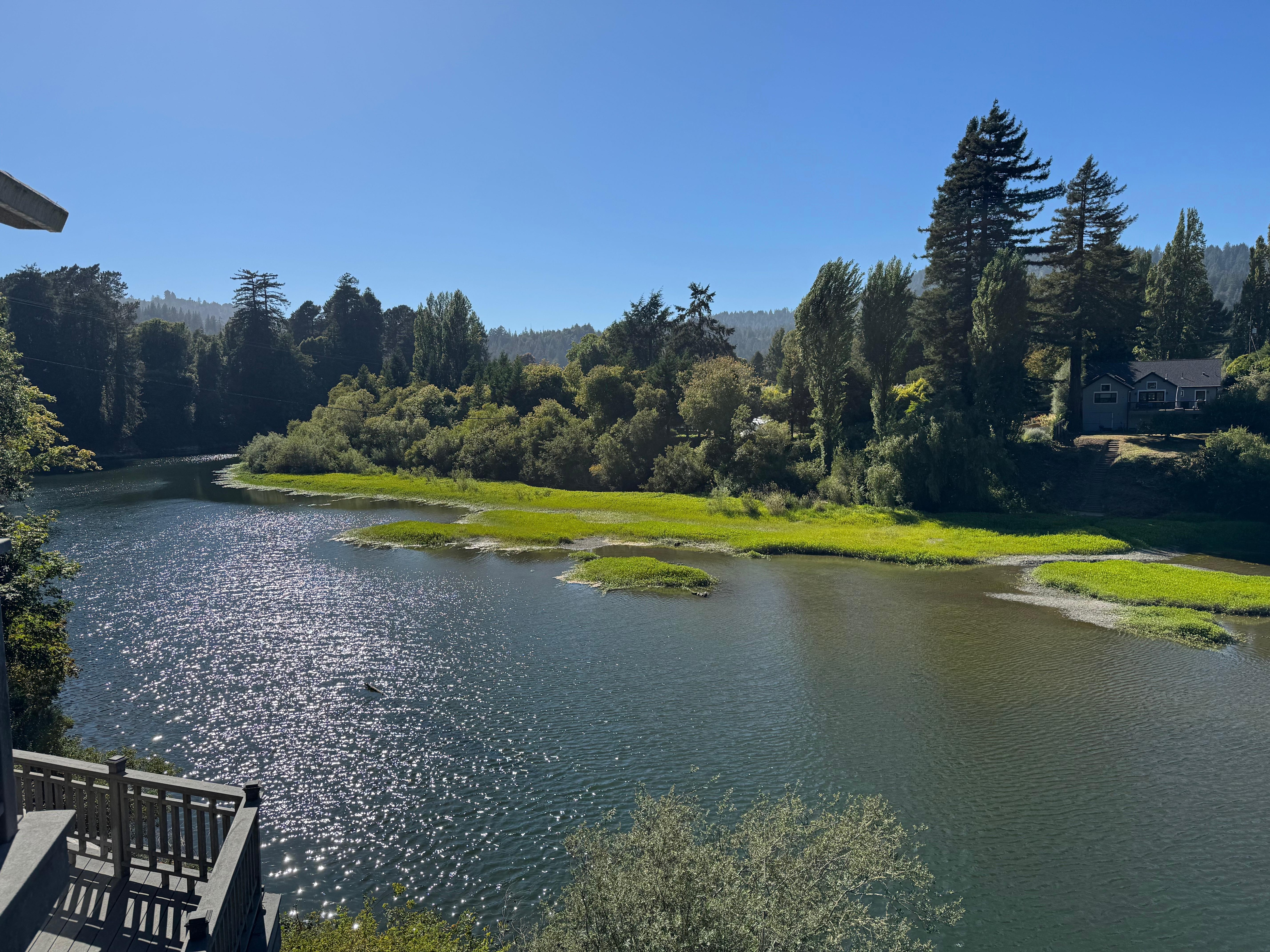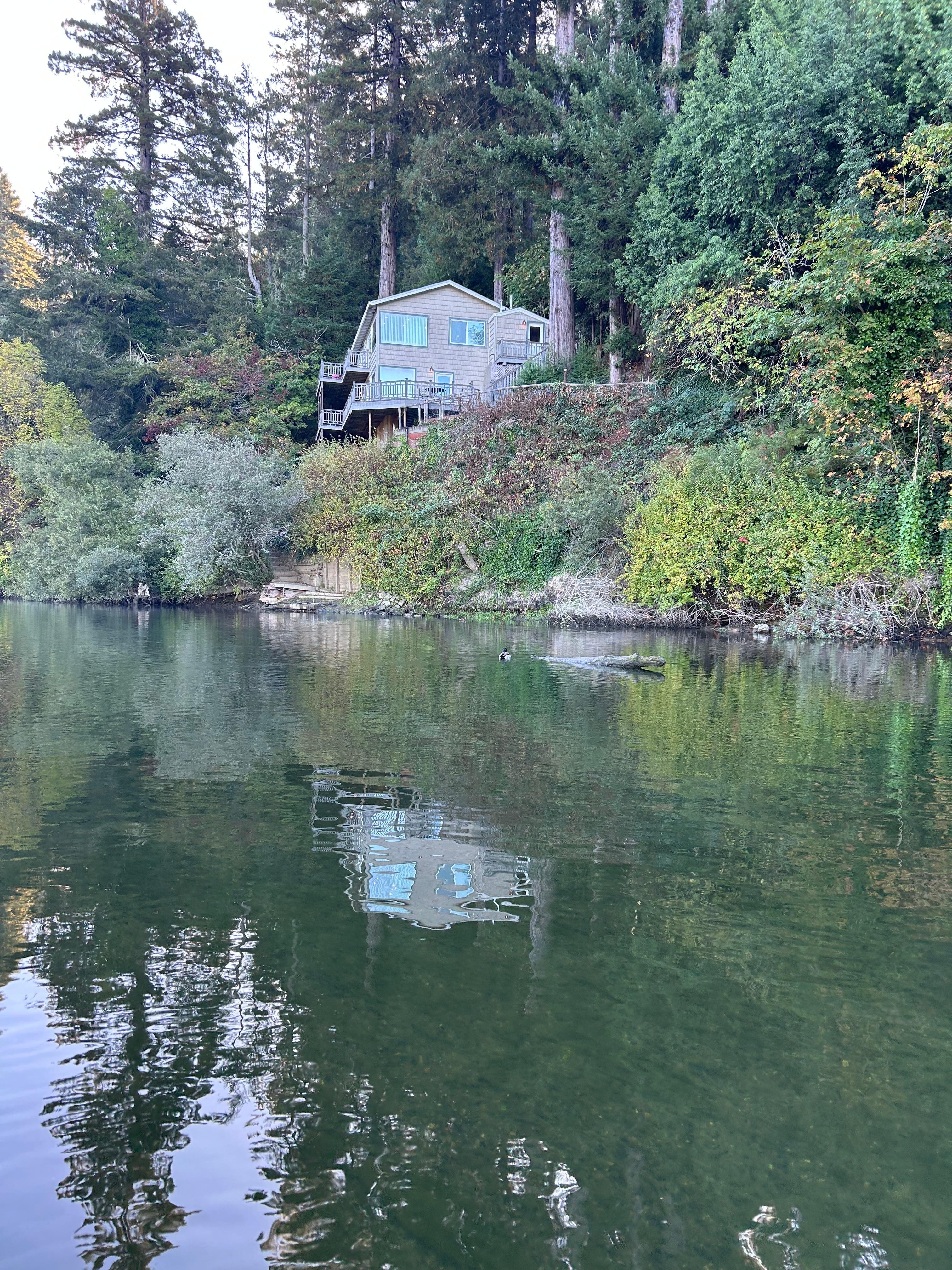 In the redwoods, above the wide, lazy curve of water, with the tree-lined ridges fading to the west, our vacation home offers a tranquil and private setting for relaxation and that 'getaway feeling.' The north and west walls are almost entirely glass, which creates a light and open atmosphere, giving you a sense of freedom and flight as you gaze at the the osprey, gull, and heron. Through every moment of your day you’re surrounded by this expansive view of the river and mountains that few other places have. And, when looking is not enough, step down the stairs to the riverbank to use the four single kayaks, or row boat (in season) to enjoy the wild, scenic lower river from Duncans Mills to the ocean.