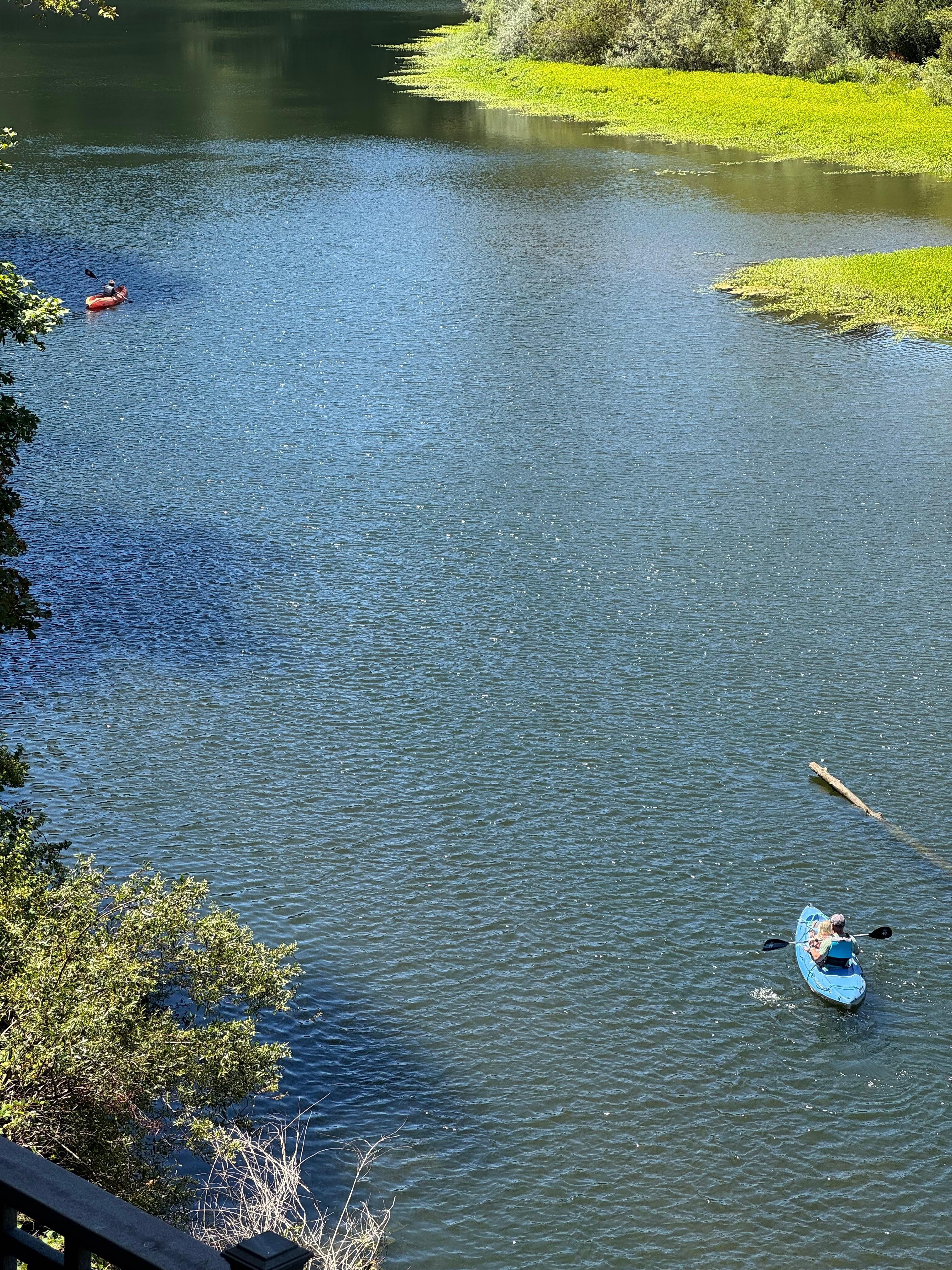 Beyond the decks, we have upper and lower terrace areas surrounded by the natural riparian forest - massive redwoods, maple, river willow and buckeye trees, with ferns, and sorrel beneath. We leave the vegetation in its natural state to support the redwood's ecosystem and the great variety of animal life that abounds in the area. We have no neighbors downstream; we look into the river forest as it continues to the west. Upstream, are two undeveloped lots filled with forest; so, we have great privacy and seclusion. There are masonry steps and gravel at the bank making it easier to get in and out of the water with the kayaks for young and old. Kayaks are available in summer and most likely in spring and fall, but not during winter due to high water and fast currents. With any question about conditions I determine the availability of the water craft.