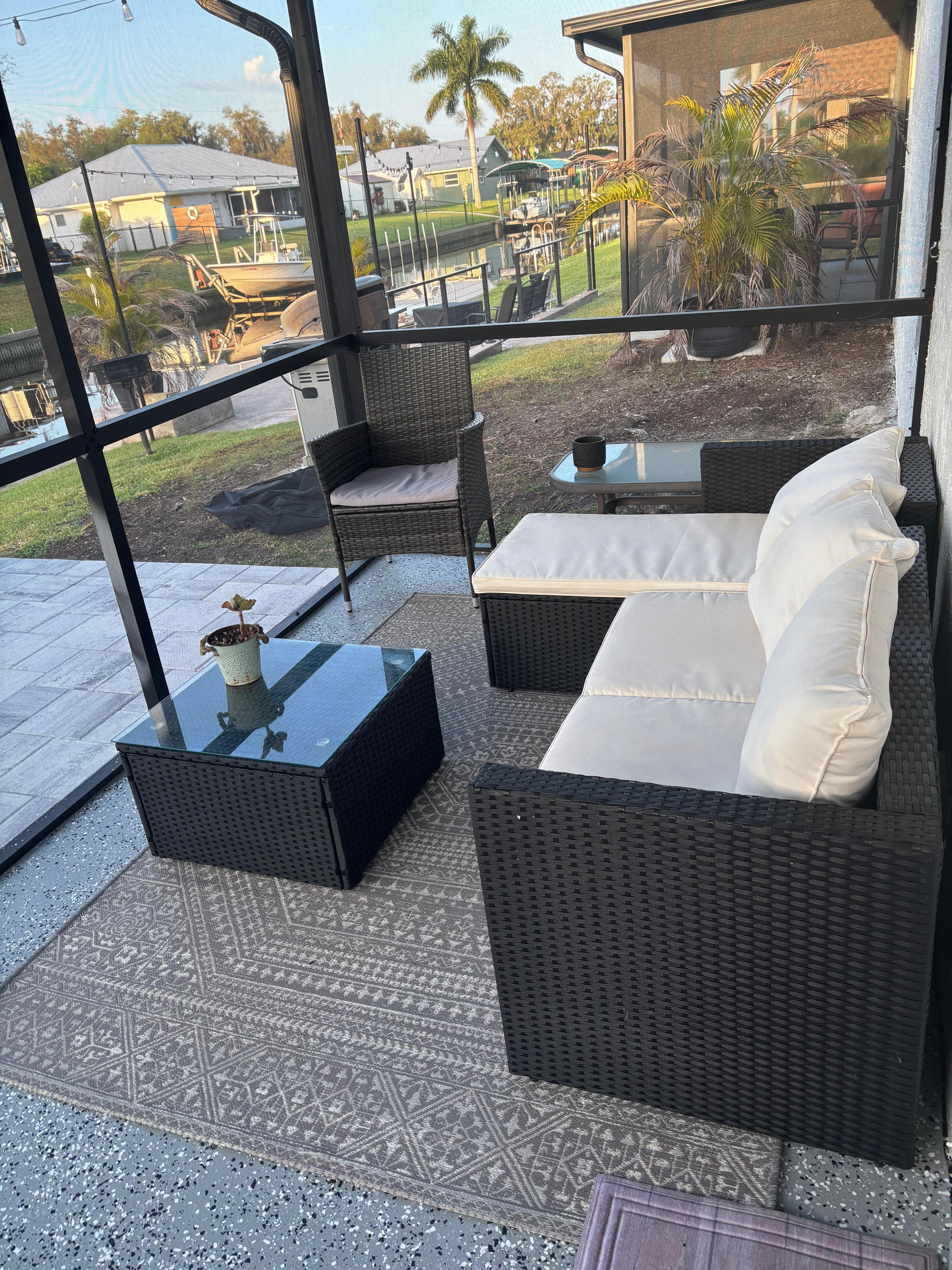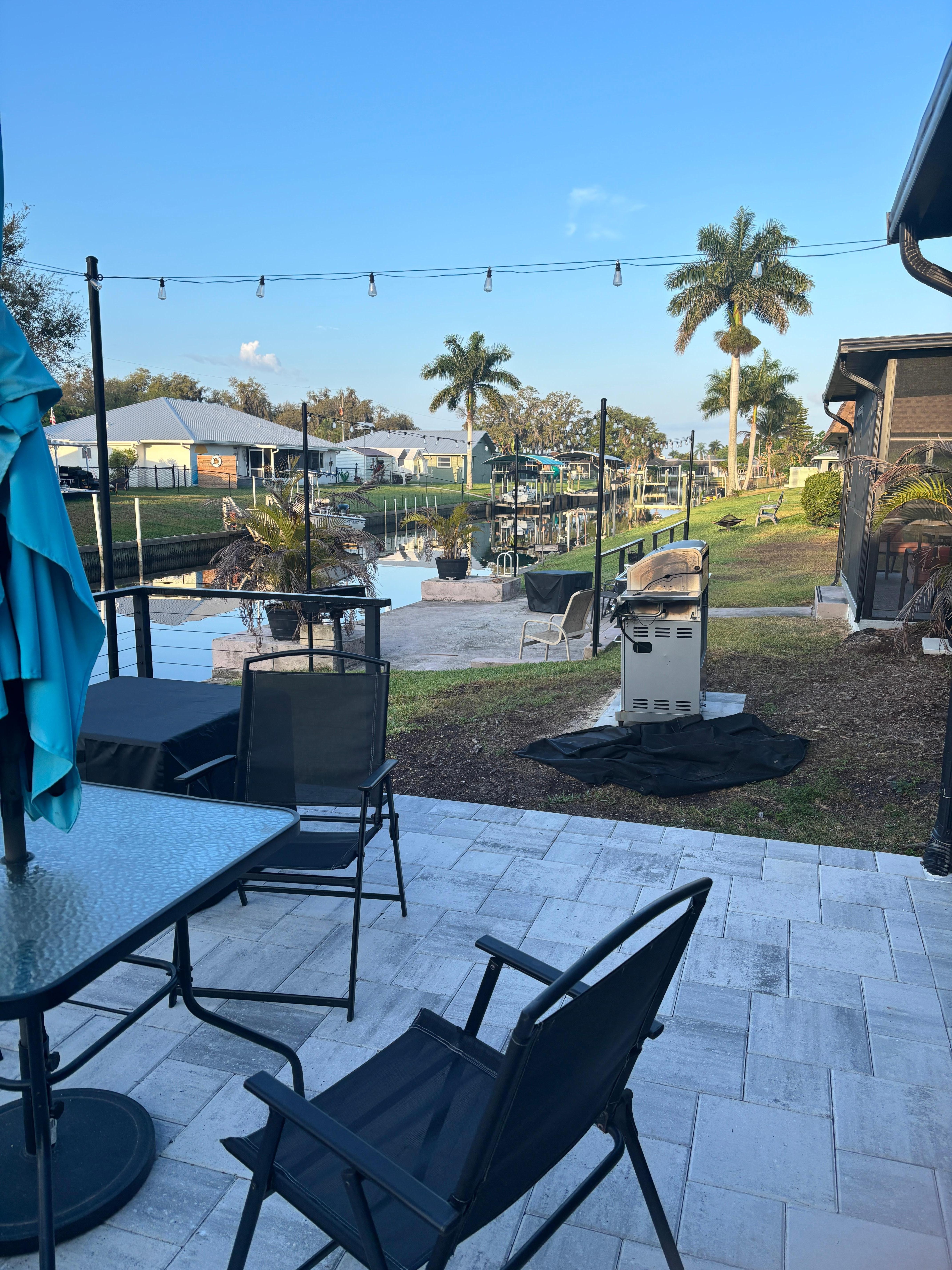 You will not be disappointed as you enter this Waterfront Freshly updated 2 Bedroom, 2 Bath Duplex. The Farmhouse decorated living room has a custom Shiplap wall with a 55" TV and an electric fireplace. Make sure you utilize the Keurig Coffee maker and make a fresh cup or a whole pot from the coffee bar. The kitchen offers a table with seating for 4 and a bar with seating for 2. It is fully equipped with all of your needs for baking and cooking. The Master bedroom offers a king size bed a 50" TV, closet luggage rack and dresser. The Master bathroom has a walk-in shower with a small step to enter. The Second Bedroom has a queen size bed, black out curtains, closet, luggage rack and a 42" TV. The second Bathroom has a tub/shower combo. There is a screened in back porch to sit on and enjoy your cup of coffee in the morning and the canal view. Enjoy your evenings taking a stroll around the neighborhood on the bicycles or taking a cruise down to the river on the kayak and paddleboard. Make sure to cast a line with the fishing poles and tackle provided. If you need live bait, there is a bait shop a short drive away. Cap off the night with a glass of wine and stories around the fire pit. For the boaters, bring your boat and enjoy the Caloosahatchee River. The South Franklin lock boat ramp is a 5-minute drive from the Caloosahatchee Hideaway. There is a landing with cleats to tie off your boat. For larger families the unit next door is also available. We can accommodate 10 guests with both units.