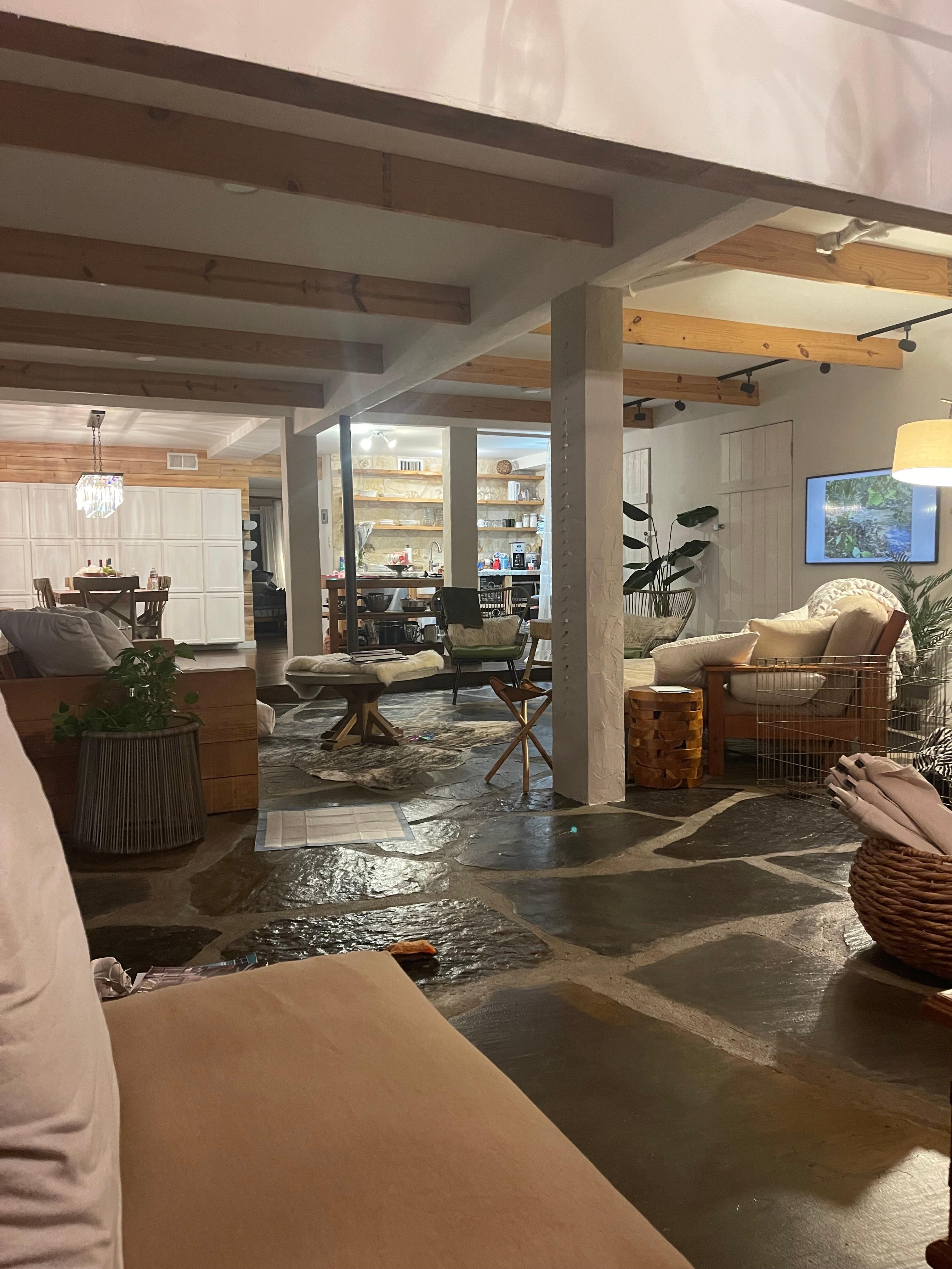 ABOUT THE DESIGN: This property offers you inspired design focused on the style and relaxed appeal of Austin, with flavors of Costa Rica. The overall vibe is "oversized loft" and absolutely “a part of the park" with incredible floors made with huge individual rough flagstones, cool limestone walls and cedar wood ceilings. Restoration Hardware crystal chandeliers fill the dining area & lounge spaces with sparkling light. A breezy sun-drenched flex space at the far end of the home opens up to the main living area creating a huge social space. This area is so comfortable, relaxing and beautiful with banks of windows and a skylight. It is the perfect entertainment space for a large group. As a conversation/entertainment space, 2 overstuffed XL futon beds make up the sectional sofa.