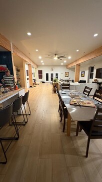 Separate from the kitchen, a full wet bar is perfect for mixing your favorite cocktails and sharing stories with friends and family. It's the ideal spot to unwind after a day of exploration on the expansive property. The Bay window and seating area make this the perfect area to enjoy the scenery.