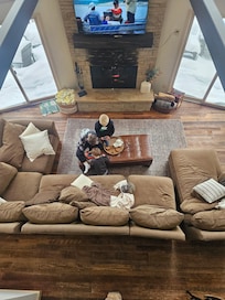 The living room has a cozy wood burning fireplace, an oversized sectional couch and a coffee table. We supply logs for the fireplace inside as well as extra stacked outside should you go through those.
