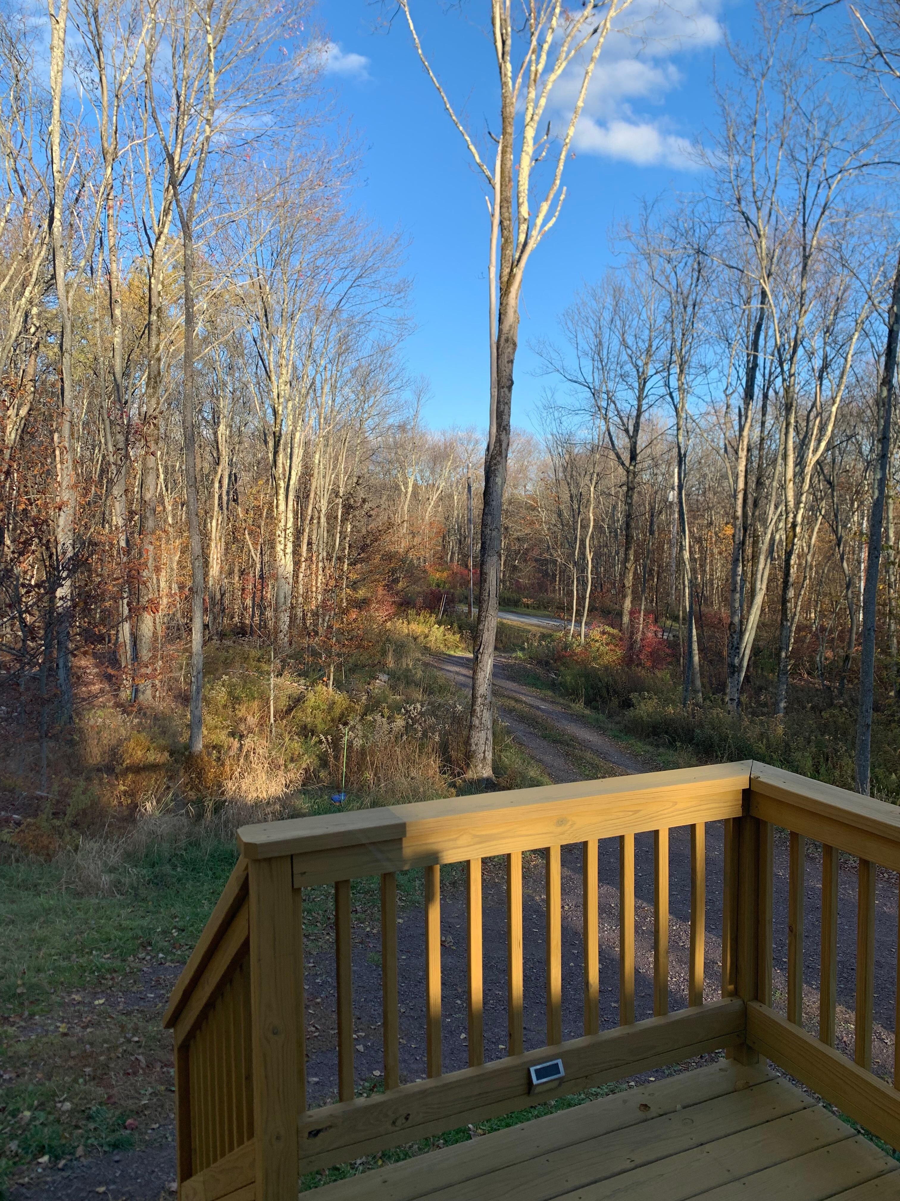 We keep the outdoors wild so, through the large double glass windows, you feel surrounded by the woods. Our trees are mostly deciduous with fall foliage colors in the bright yellow to reds, sunny winters, and wild ferns under the canopy shade in the summer.