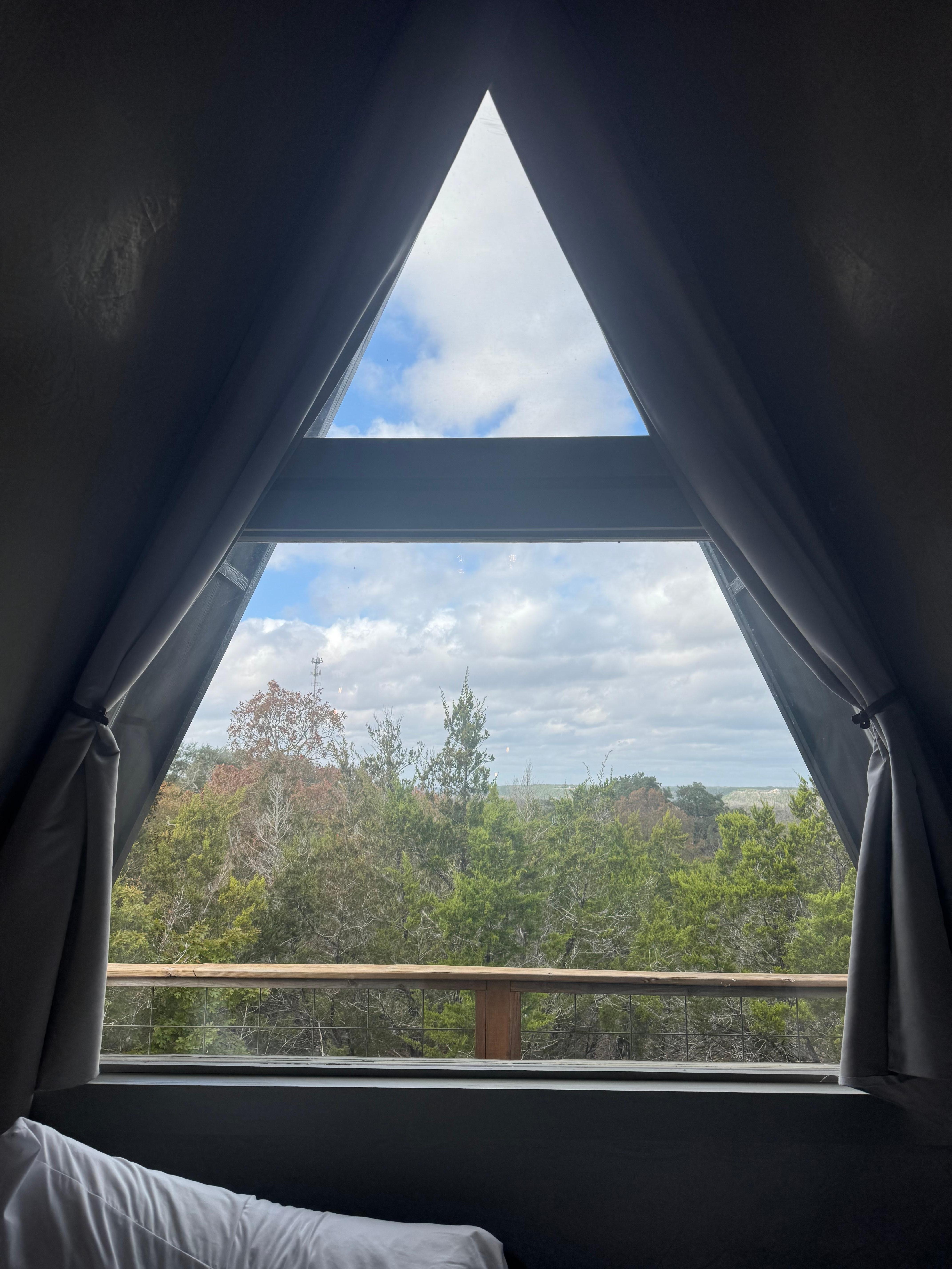 • Comfy Living: Enjoy a comfortable shower, a small dining table, and a California king bed positioned under a huge A-frame window, allowing you to wake up to stunning vistas.