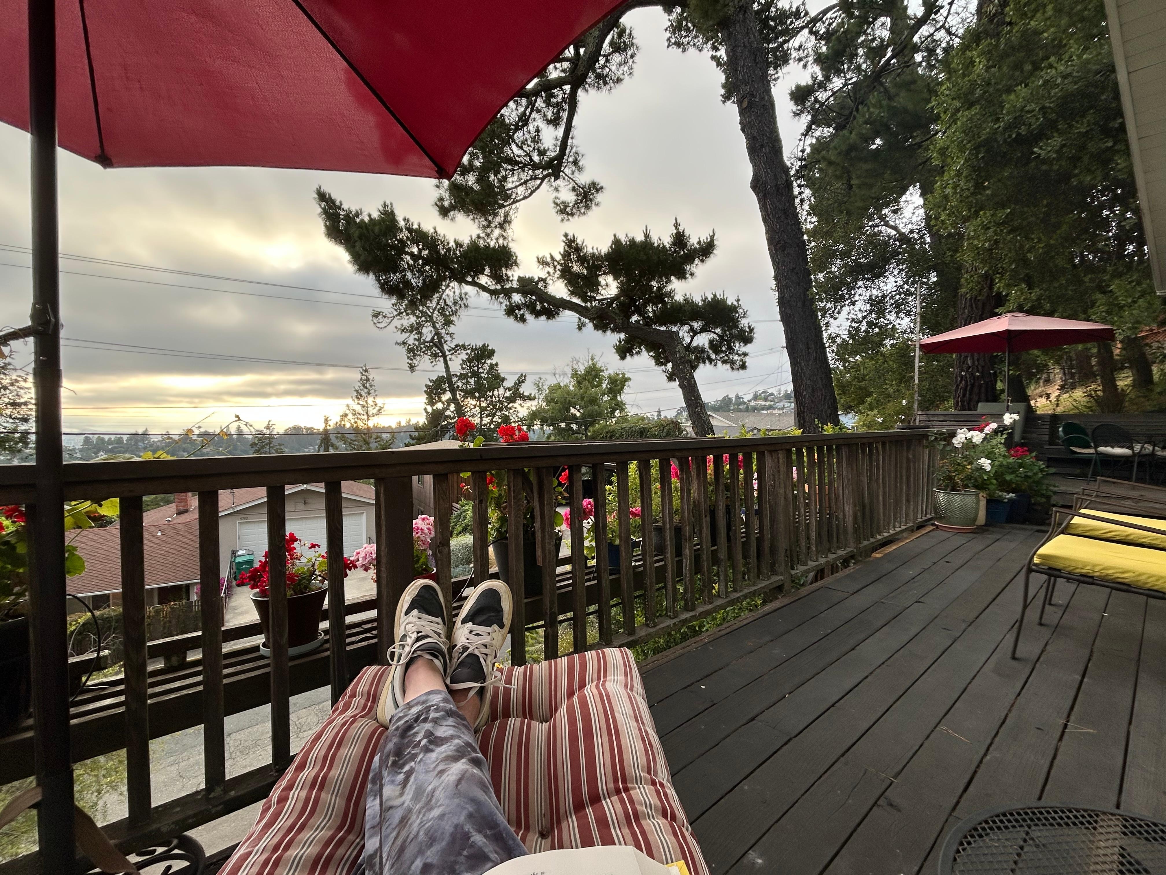 Our sunny, secluded Oakland Hills home is perched high in the hills of Piedmont Pines with a front deck providing wonderful views of Marin County, San Francisco, the Bay Bridge and the Golden Gate Bridge. There are outside tables and chairs for outside dining, plus a gas barbecue. We also have a private back patio with a ping pong table.